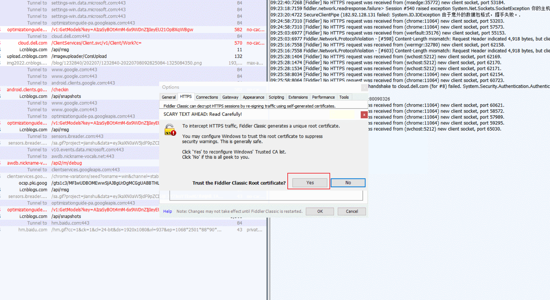 2.依次勾选"Capture HTTPS CONNECTs"(捕获HTTPS连接)和勾选"Decrypt HTTPS traffic"(解密HTTPS流量),然后会弹出一个对话框 直接点击YES即可。如下图所示:
