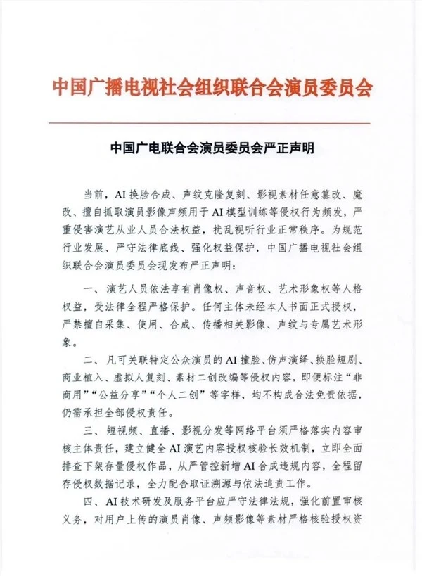 🔥 热点聚焦: 中国广播电视社会组织联合会演员委员会发布严正声明,针对当前AI换脸、声纹克隆等侵权乱象明确监管边界,严禁任何主体未经授权采集演员影像与声频数据用于模型训练、合成复刻等行为。声明强调,即便标注非商用、仅供娱乐,无书面授权仍不构成法律免责,同时要求技术平台与网络平台建立前置审核与授权核验机制,行业将启动常态化监测并开展批量法律维权,全面守护演艺人员肖像与声音相关合法权益。