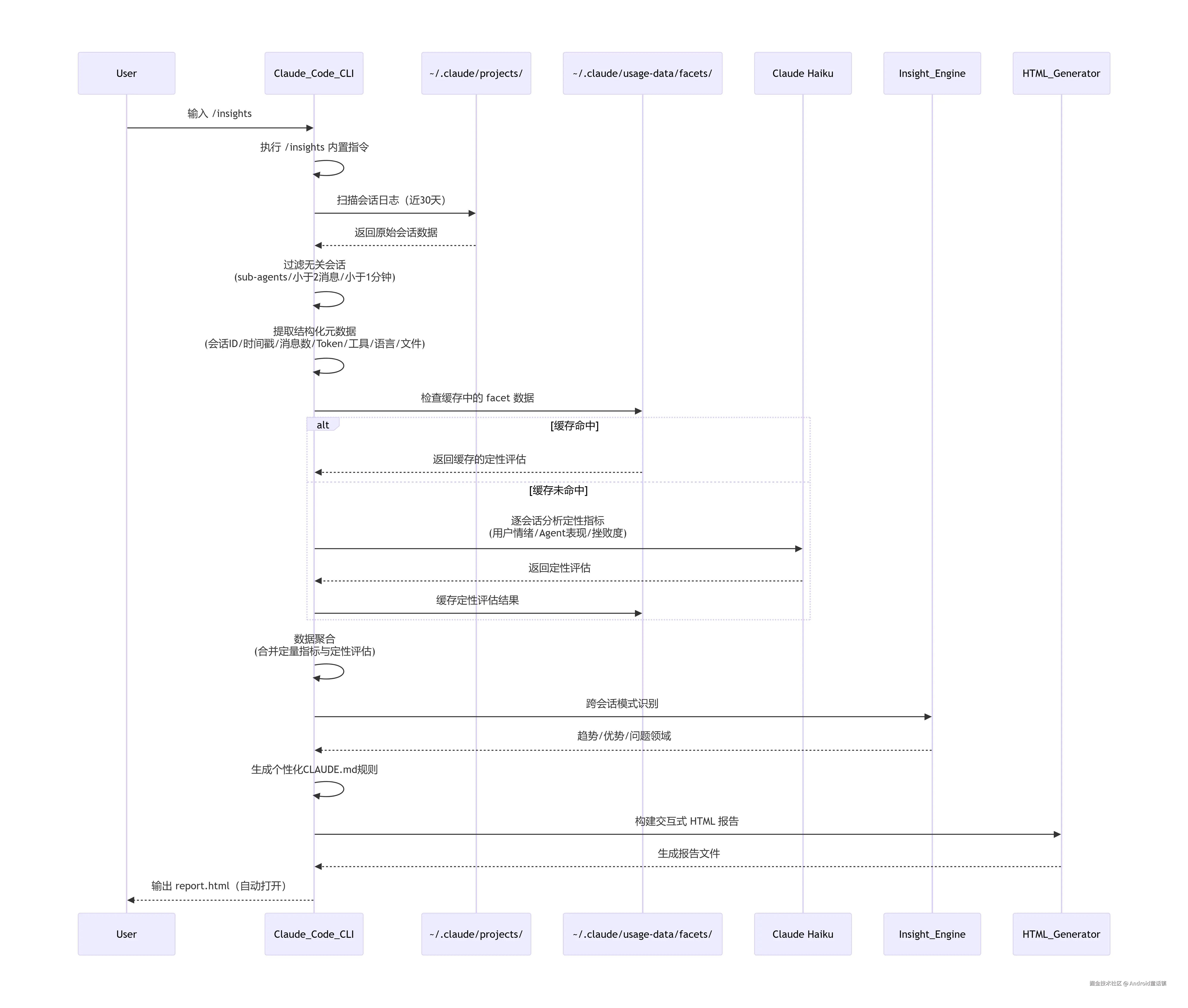 当你输入 /insights 时,背后是一套完整的七步数据分析流水线 ,融合了定量指标计算和定性语义分析。整个流程的完整时序图如下: