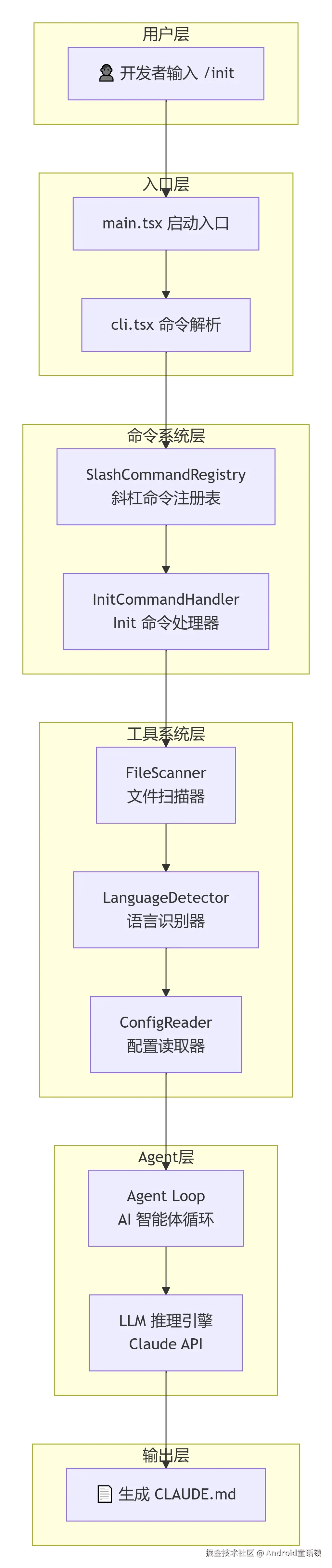 Claude Code 采用六层分层架构 ,每一层职责清晰、松耦合。文件扫描器、项目分析器、AI SDK 各司其职,使得 /init 的实现非常清晰。