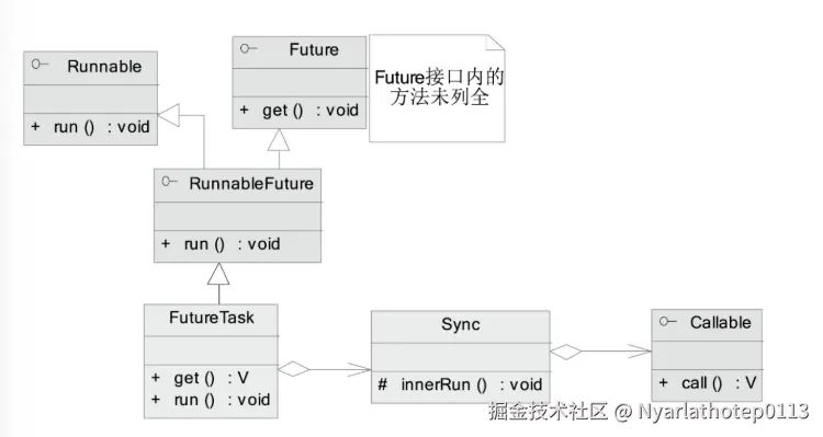 FutureTask是RunnableFuture的一个具体实现类,其内部有一个内部类Sync,Sync最终会调用Callble接口,完成实际数据的组装。