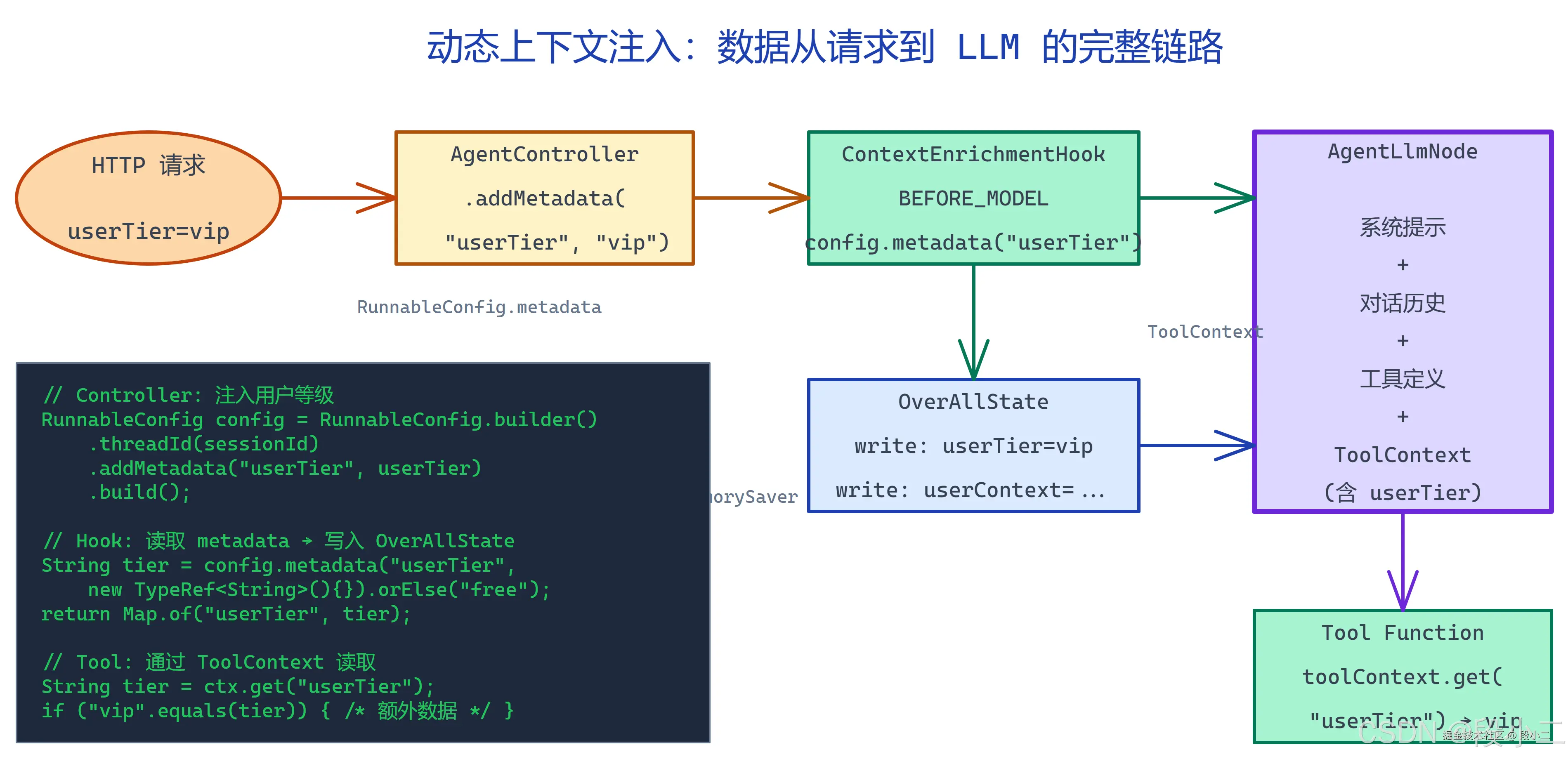 加了这 4 处变化之后,addMetadata → ContextEnrichmentHook → OverAllState → UserTierLimitHook + 工具层这条链路全部打通。如果你还需要 LLM 在推理时感知用户等级(改变语气、主动推荐),可以继续在 ModelInterceptor 里叠加------不影响 OverAllState,不增加 Token 开销。