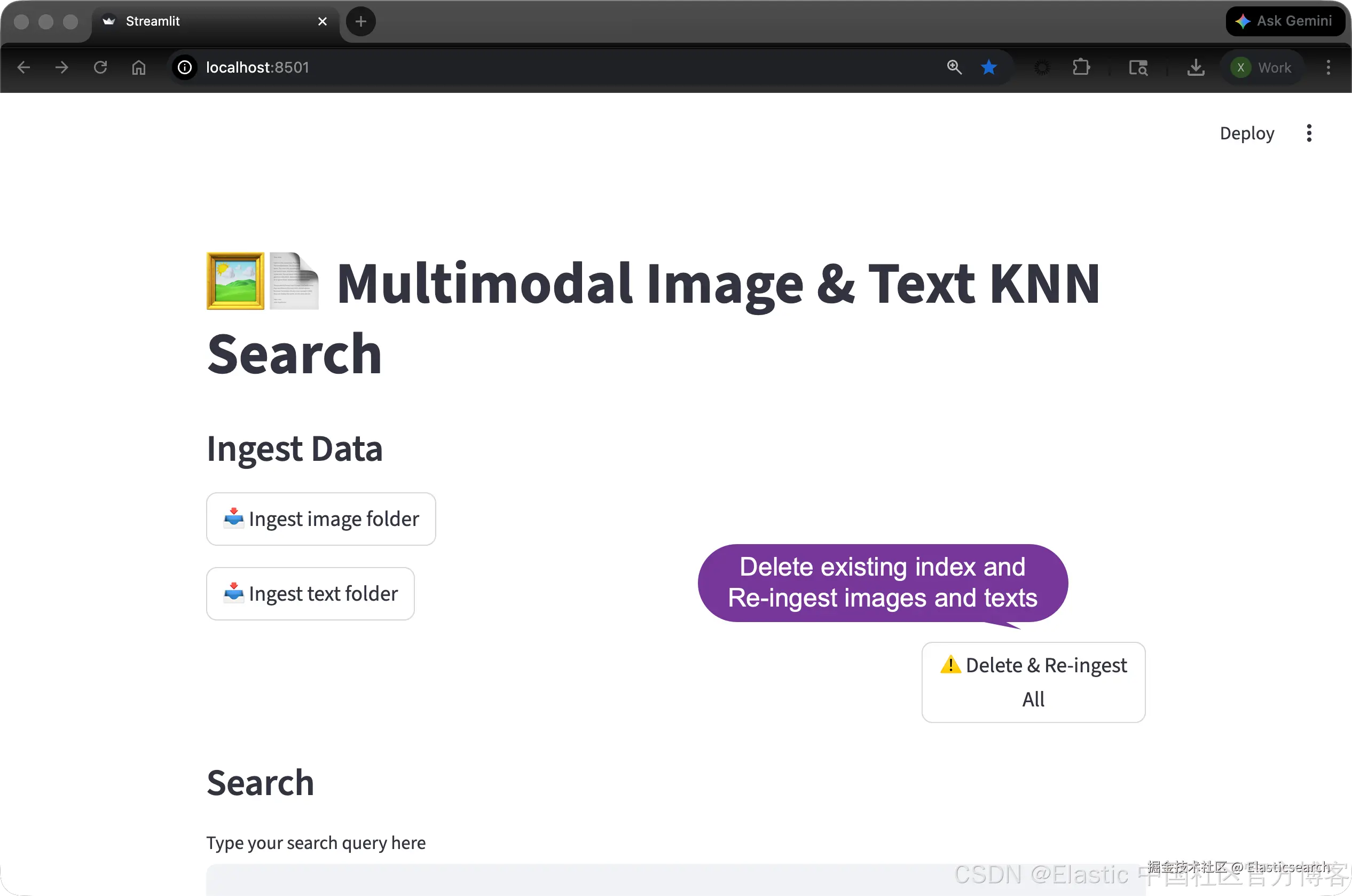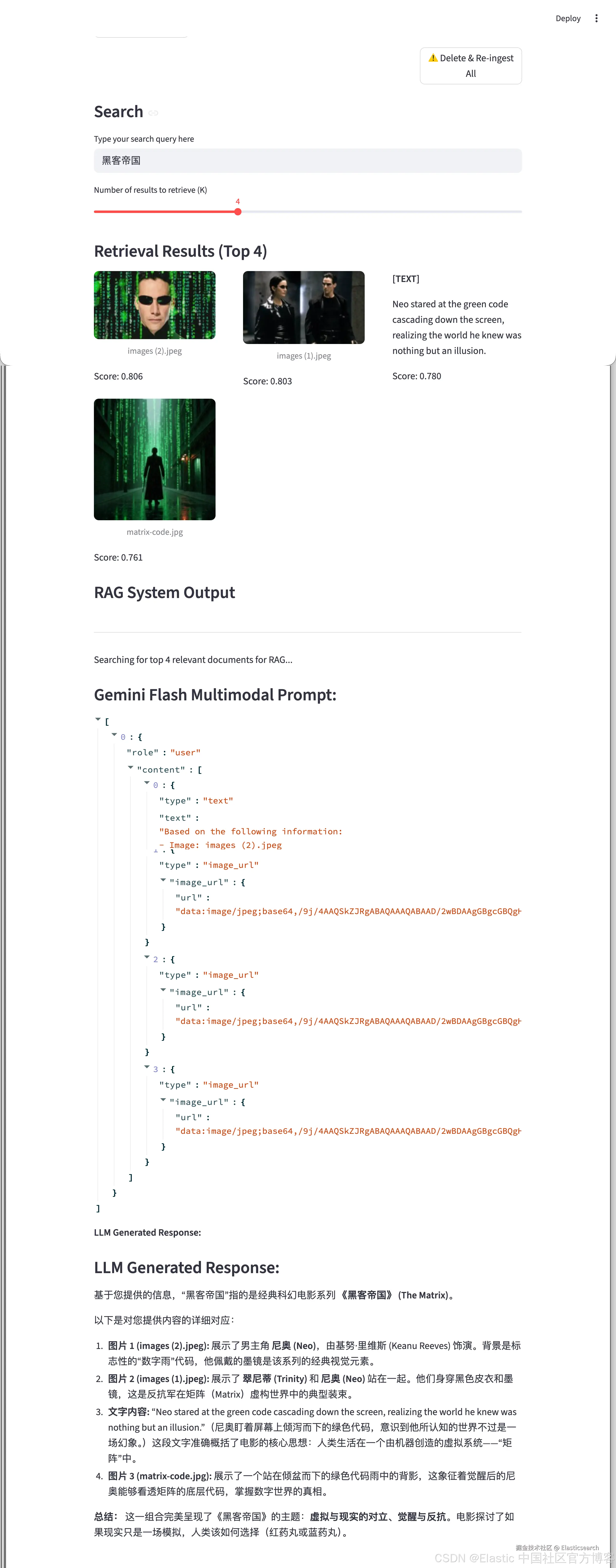 首次运行,我们可以直接点击 Delete & Re-ingest All 按钮来写入所有的 images 及 texts。当然我们也可以分别使用 ingest image folder 及 ingest text folder 来完成文件的写入。值得注意的是:它们并不会删除之前的索引数据,而且重新写入 images 或 texts 目录里的文件。如果多次点击这个按钮,它会对该文件夹中的文件多次写入。