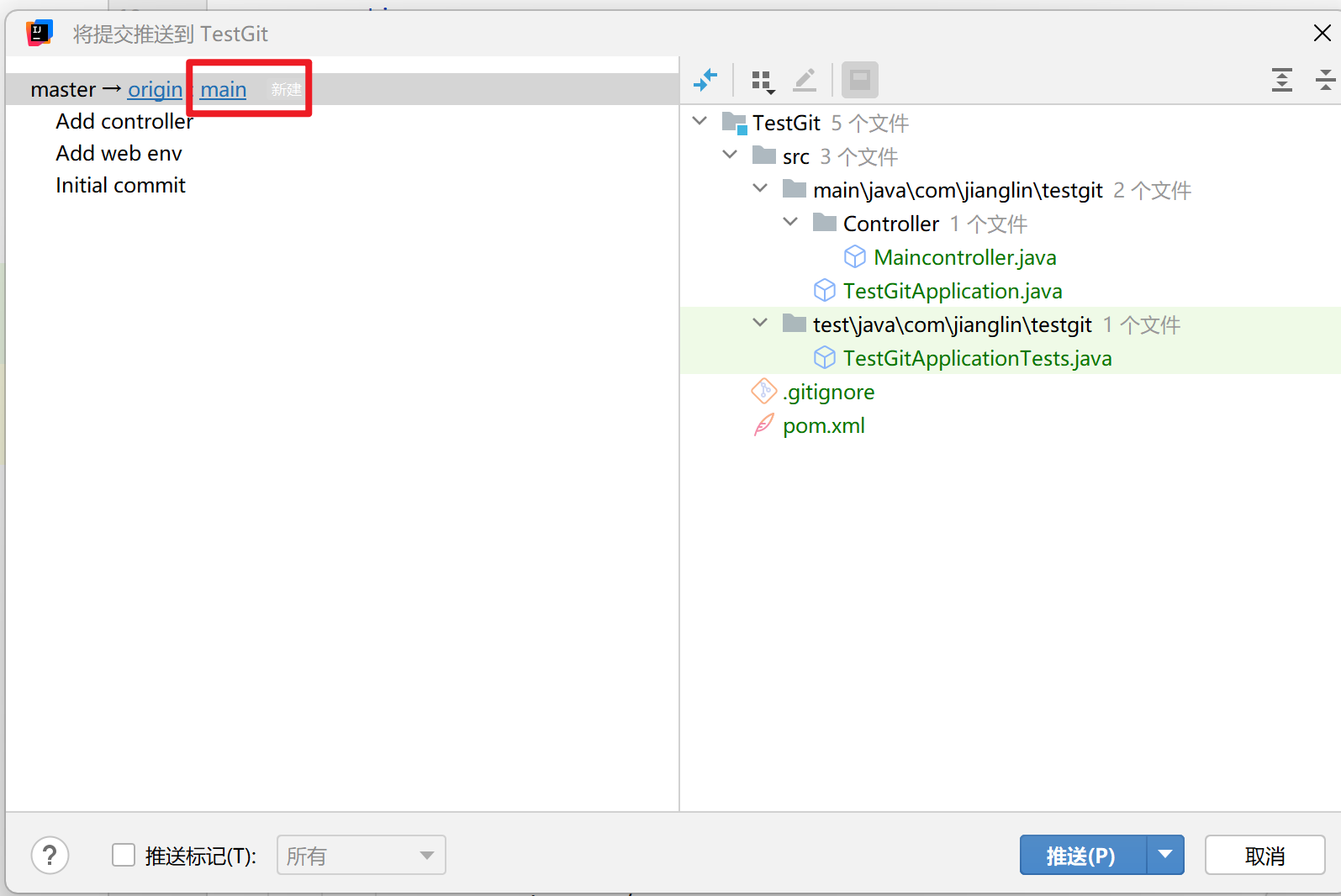 可修改分支名称,表明IDEA的master分支是提交到远程仓库的main分支上