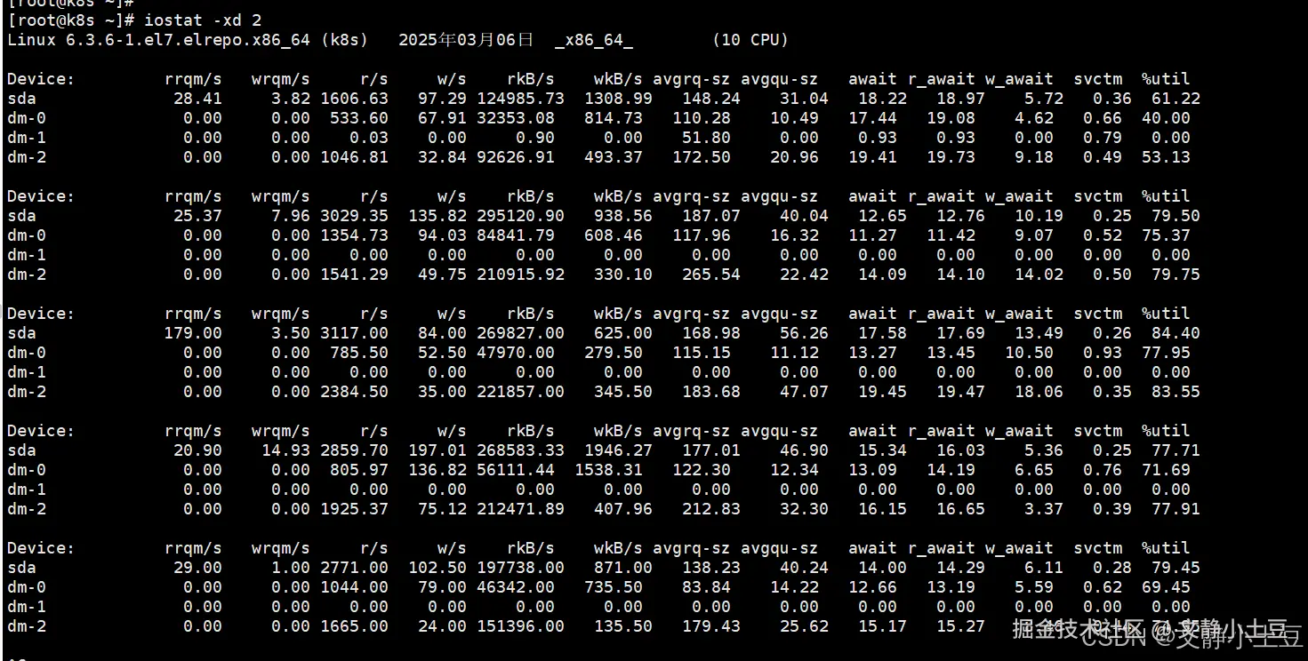 dm-0的 %util 达 100%(参考输出第二组数据)。 - 读写吞吐 :首次采样 rkB/s=126,551.57 (约 123.6 MB/s),说明大量读操作。
