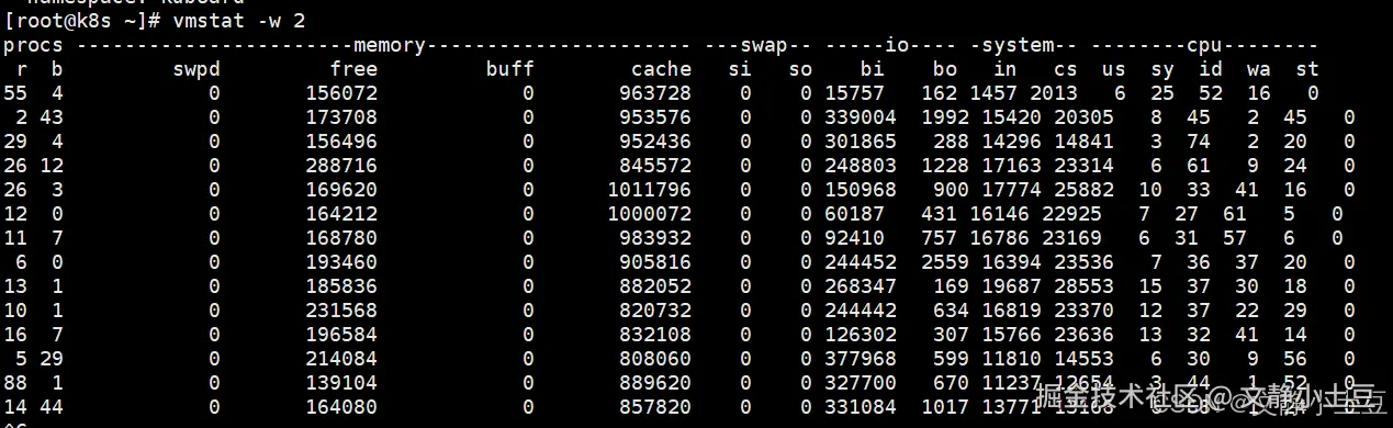 r列) :多次超过 50 (如r=88),远超CPU核心数(10核),说明进程排队严重。 - 等待I/O的进程(