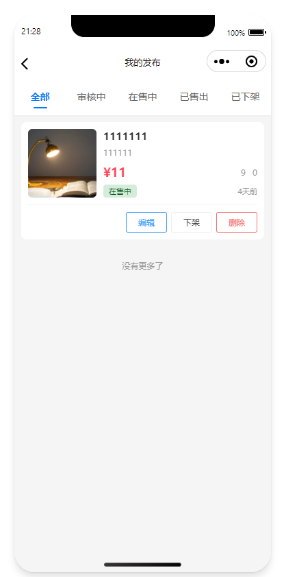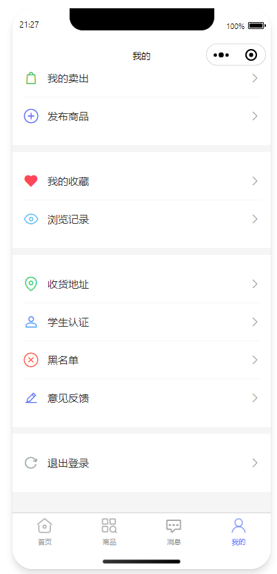 3.我的,包含全部订单、商品管理(我的发布、我的卖出、可进行商品发布)、我的收藏、浏览记录、收货地址设置、学生认证模块、黑名单、可提交意见反馈