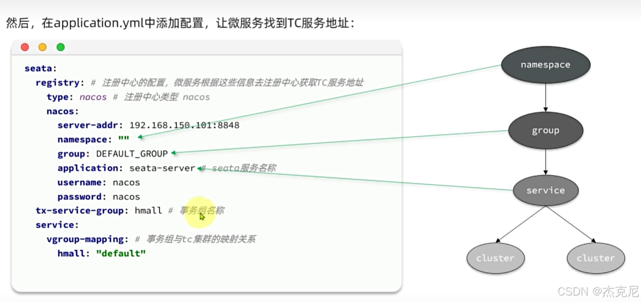 XMLseata: registry: # TC服务注册中心的配置,微服务根据这些信息去注册中心获取tc服务地址 type: nacos # 注册中心类型 nacos nacos: server-addr: 192.168.150.101:8848 # nacos地址 namespace: "" # namespace,默认为空 group: DEFAULT_GROUP # 分组,默认是DEFAULT_GROUP application: seata-server # seata服务名称 username: nacos password: nacos tx-service-group: hmall # 事务组名称 service: vgroup-mapping: # 事务组与tc集群的映射关系 hmall: "default"然后,改造