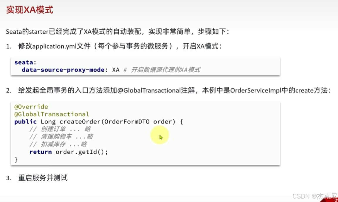 @GlobalTransactional注解就是在标记事务的起点,将来TM就会基于这个方法判断全局事务范围,初始化全局事务。我们重启