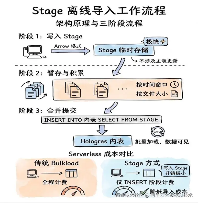 简化数据链路 :无需依赖外部的 OSS 或 HDFS 作为中转,Stage 完全由 Hologres 内部管理,通过标准 SQL