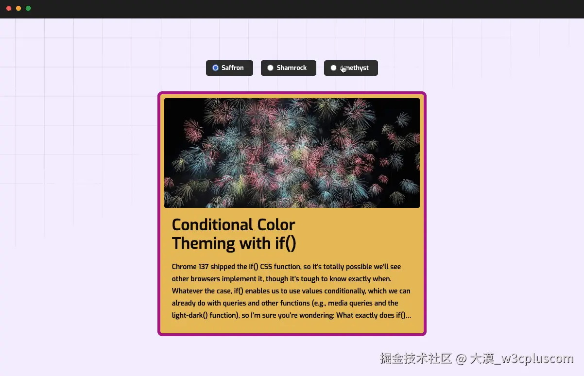 实际上,上面的主题示例,即使不使用 if(),也可以通过 @container style() 查询来实现。你可以根据容器中定义的样式变量(例如主题标识),在不同条件下应用对应的样式规则。这种方式同样能够实现按需切换主题效果,并且完全基于 CSS 的声明式能力完成。