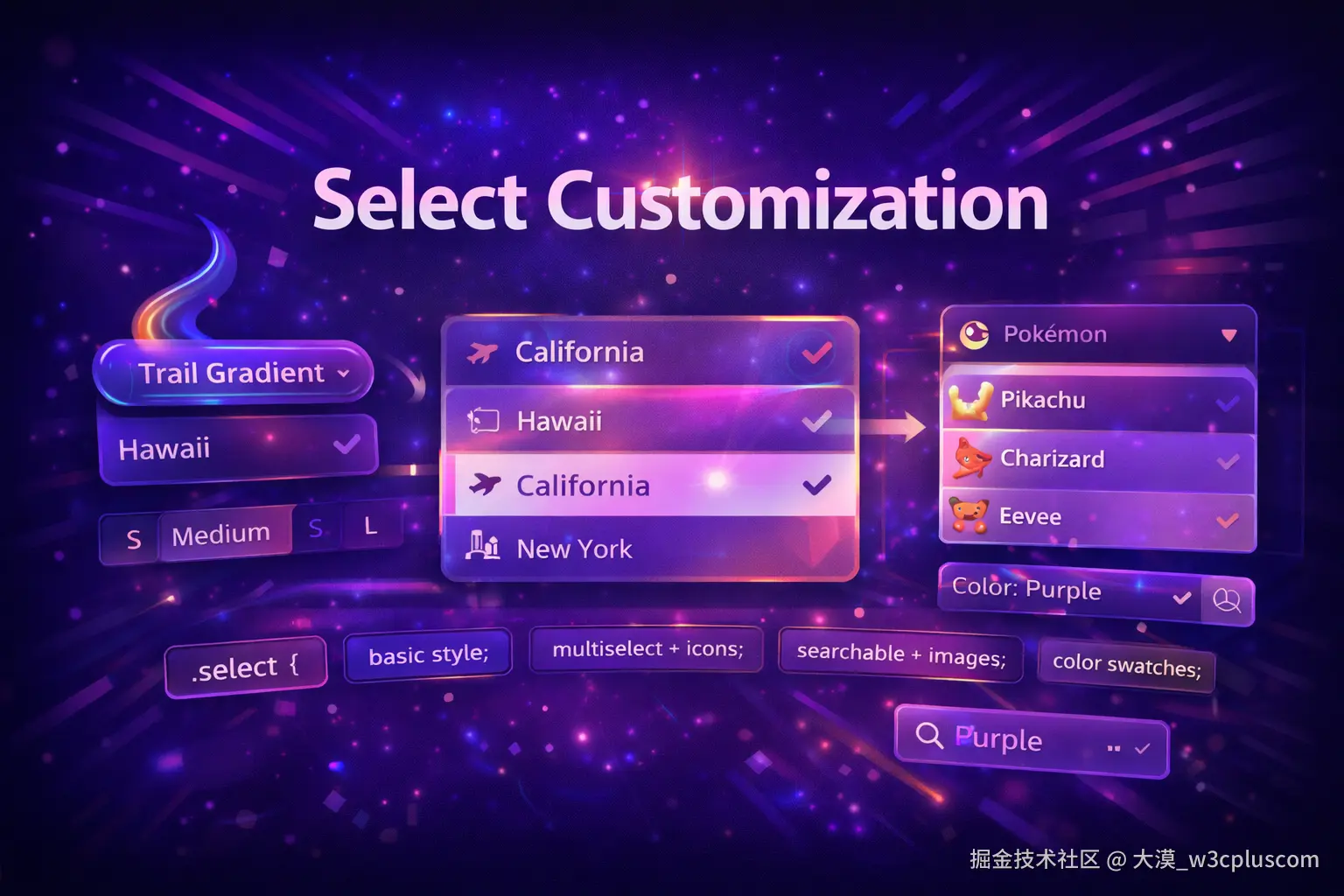 最后是表单控件这个长期的痛点。由于原生 <select> 难以样式化,开发者往往选择使用诸如 React Select 这样的库,从零实现一个组件。但随着 CSS 对原生控件样式能力的不断增强,我们越来越可以在保留原生语义和可访问性的前提下,对其进行自定义,而不是彻底重写。