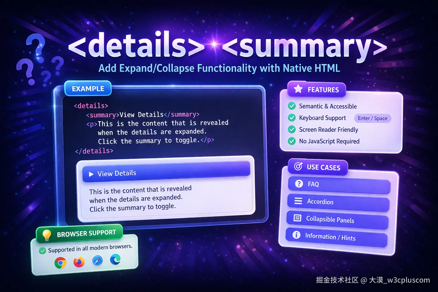 这些能力如今已经在 Google Chrome、Mozilla Firefox 和 Safari 中成为基础功能。对于绝大多数常见场景来说,它已经可以替代过去依赖各种第三方 JavaScript 库所实现的整套交互逻辑。