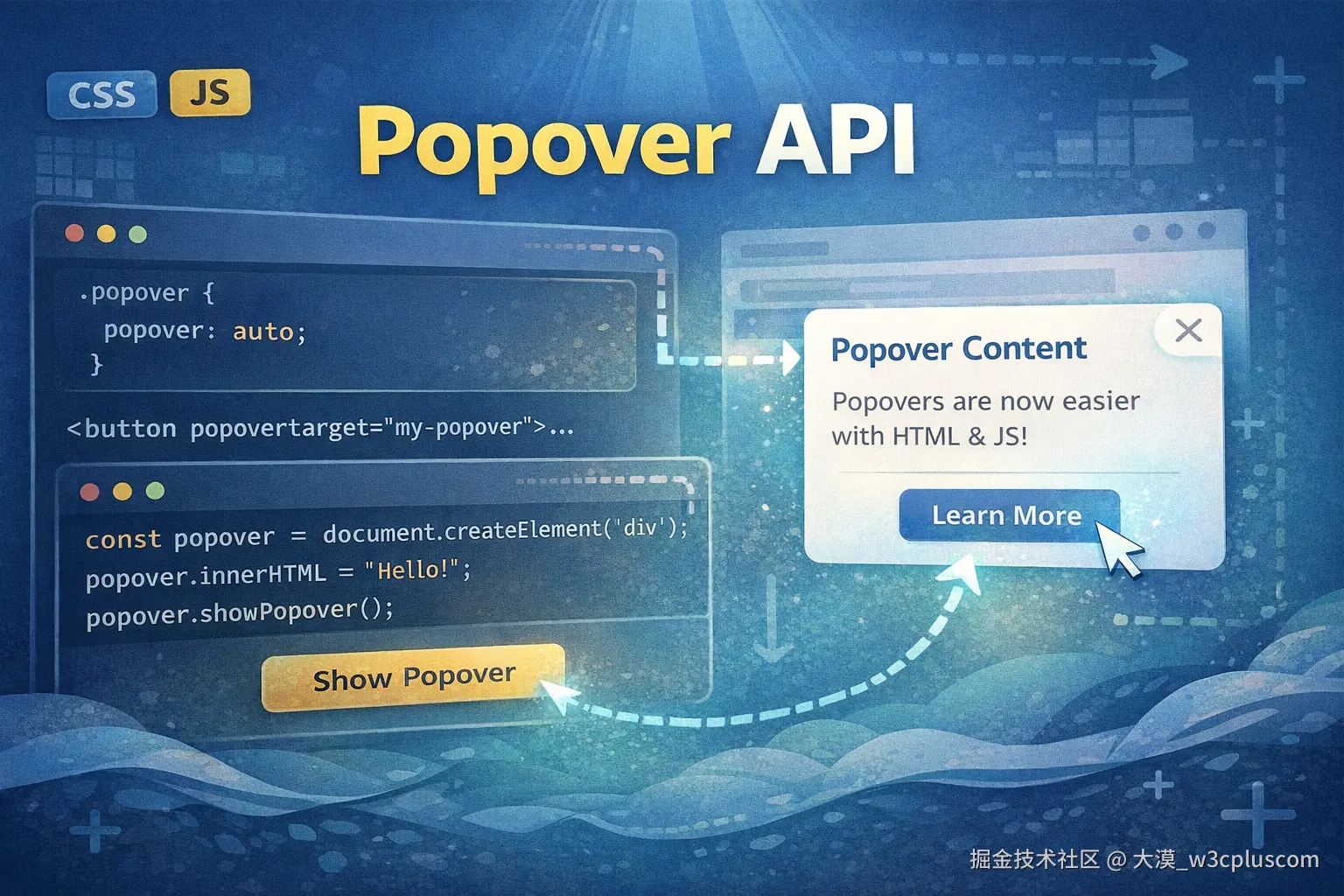 CSS 锚点定位和 HTML Popover API,其实是在解决同一个问题的两个不同侧面。CSS 锚点定位负责"浮层出现在哪里",HTML Popover API 负责"浮层是否出现"。也就是说,CSS 锚点定位负责处理位置,而 HTML Popover API 处理可见性、交互行为以及可访问性。一套完整的提示框(Tooltip)或弹窗(Popover)组件,通常需要两者配合使用。