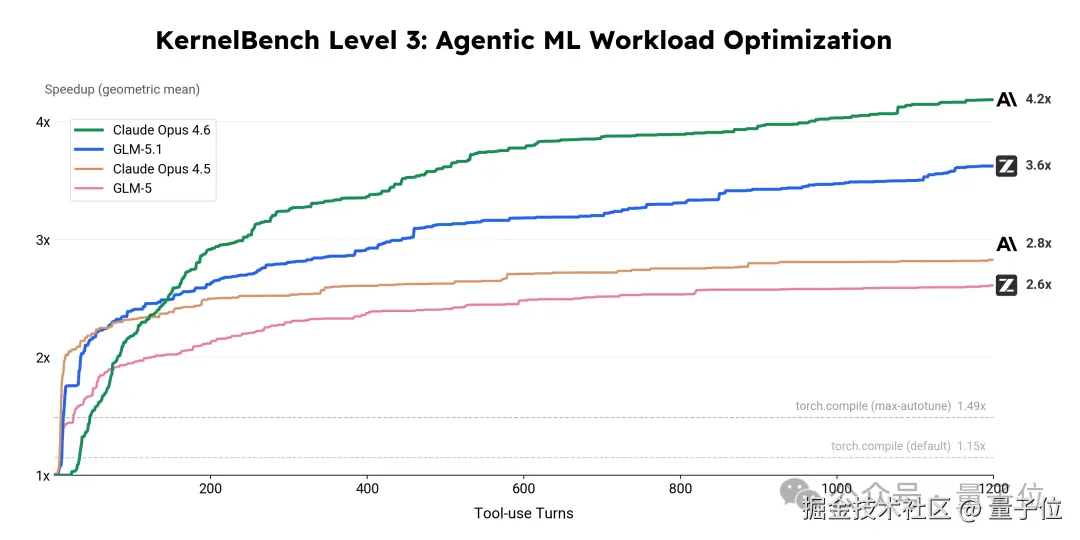 从这个过程中可以看到,GLM-5.1 能够自主编写定制 Triton Kernel 和 CUDA Kernel,运用 cuBLASLt epilogue 融合并实施 shared memory tiling 与 CUDA Graph 优化。