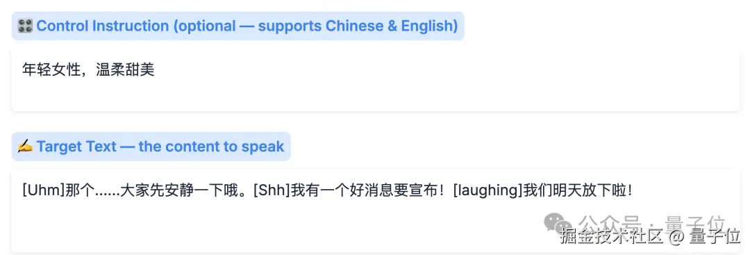 然后如果想克隆声音的质量有保证,建议上传的参考音频尽量大于等于 5 秒;以及你还可以在 "Control Instruction" 里面添加提示词,改变参考声音的情绪和语速等等。