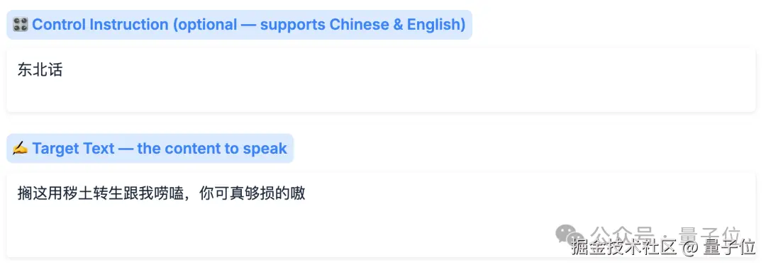 然后在它的下方,我们填一个 "东北话" 的指令,再把台词写进要合成的文本里,例如: