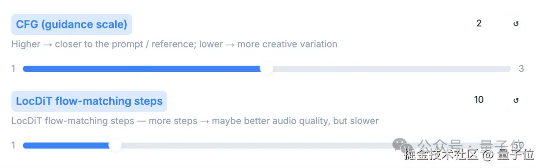 第三个就是 LocDiT,设置它的步数越高,音频效果就会越好,但生成的速度就会变慢。