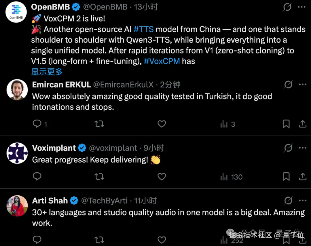 不少歪果仁在 VoxCPM 2 发布之后就立马去尝了下鲜,纷纷表示 "自家语言的效果针不戳!"