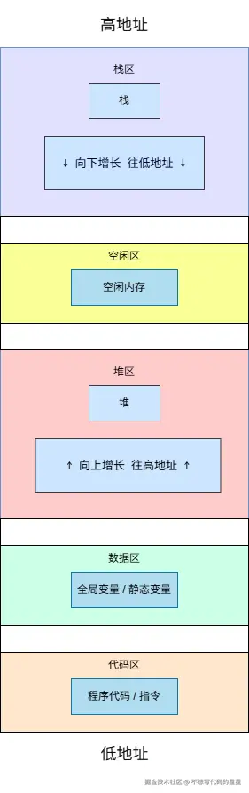 - 栈区:函数调用时,局部变量、函数参数放上去用,用完自动清理。非常快,但地方小,放太多就容易栈溢出。