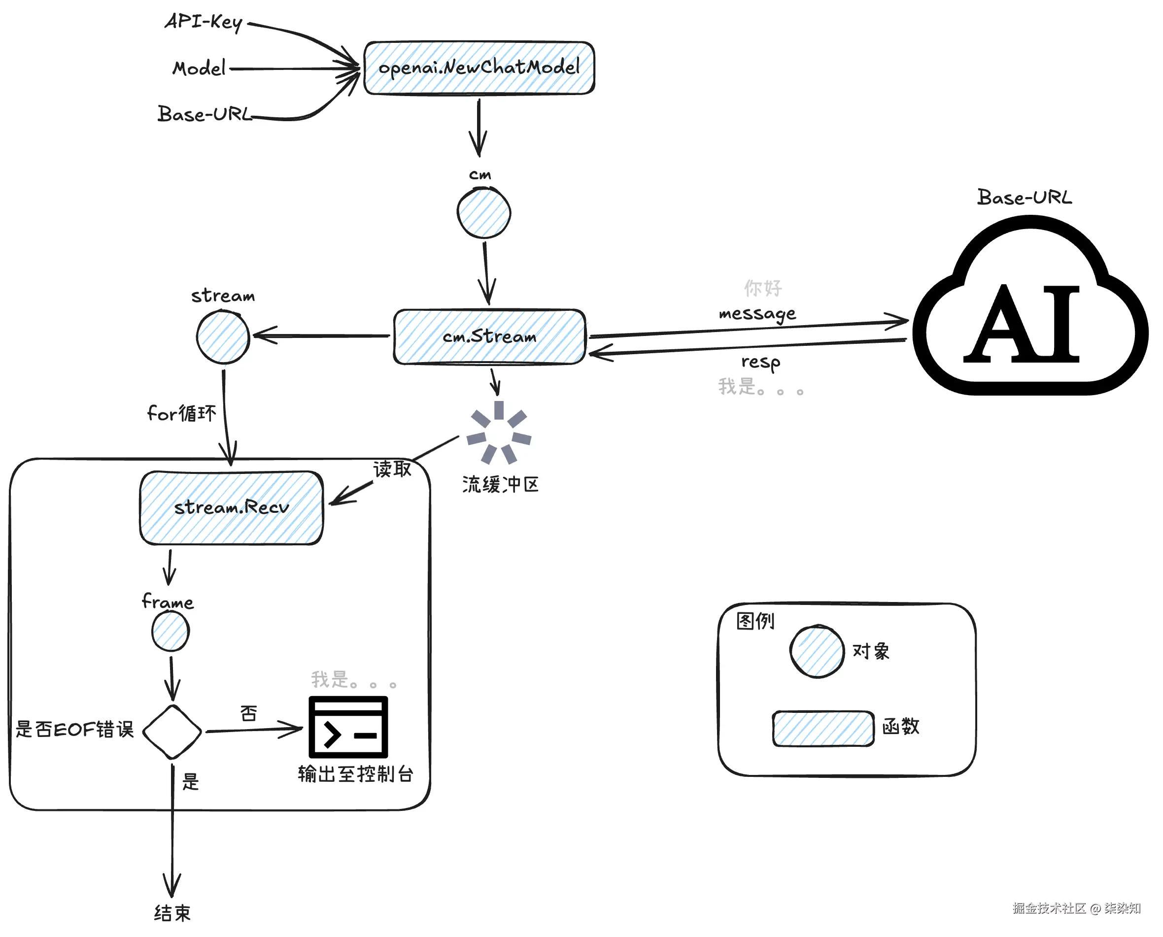 stream对象是一个流式读取器,类型为*schema.StreamReader[*schema.Message]