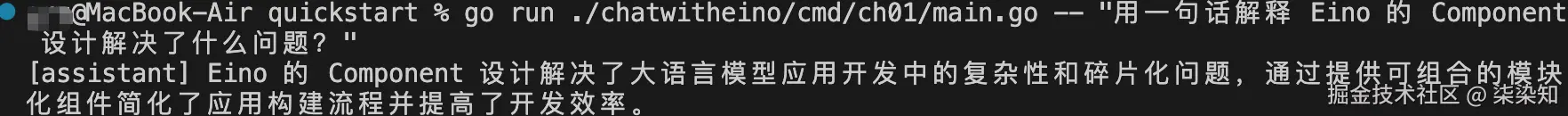go run ./chatwitheino/cmd/ch01/main.go -- "用一句话解释 Eino 的 Component 设计解决了什么问题?"