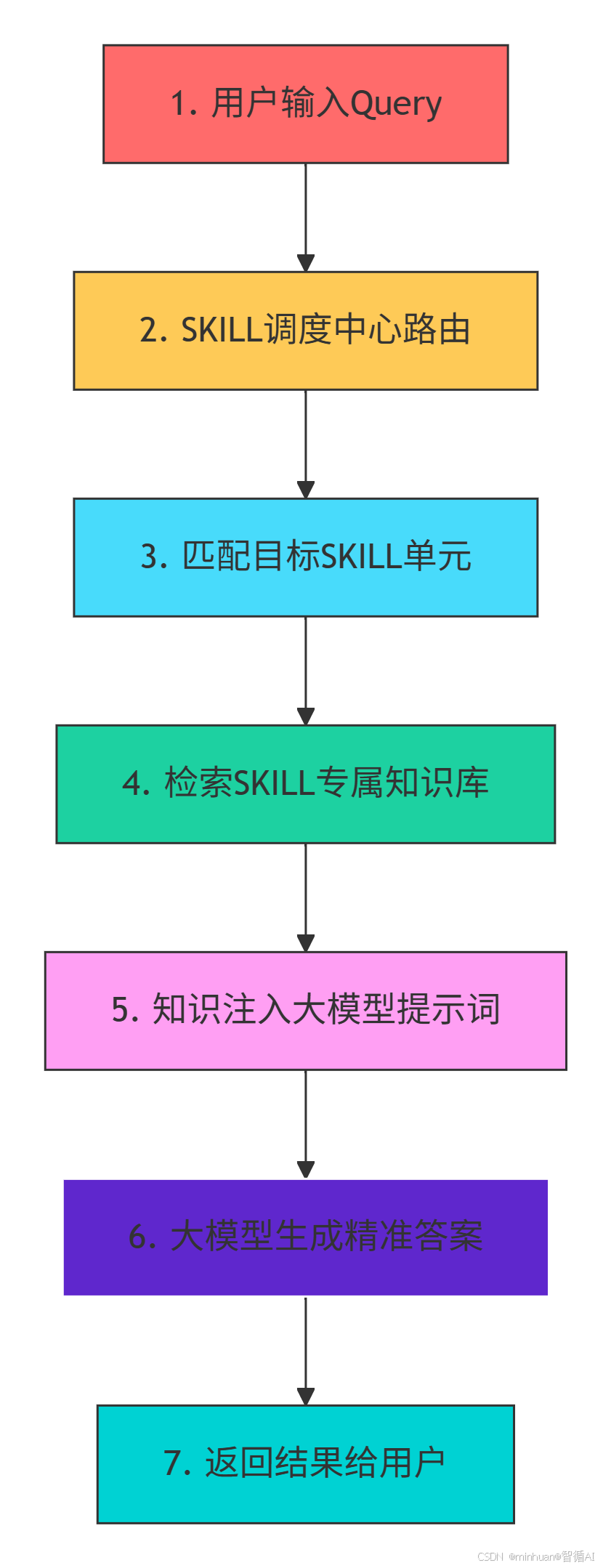 - 用户请求 → 大模型核心层 → 调度中心 → 匹配SKILL → SKILL执行(检索知识库) → 结果返回大模型 → 最终回复。