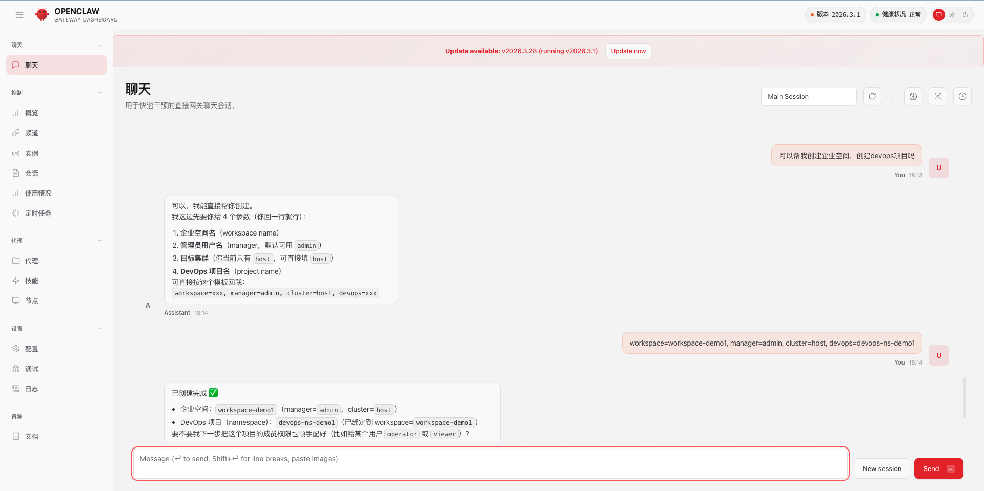 OpenClaw 会先识别需要补齐的关键参数,再把企业空间创建、项目创建和角色授权串成一条完整路径。