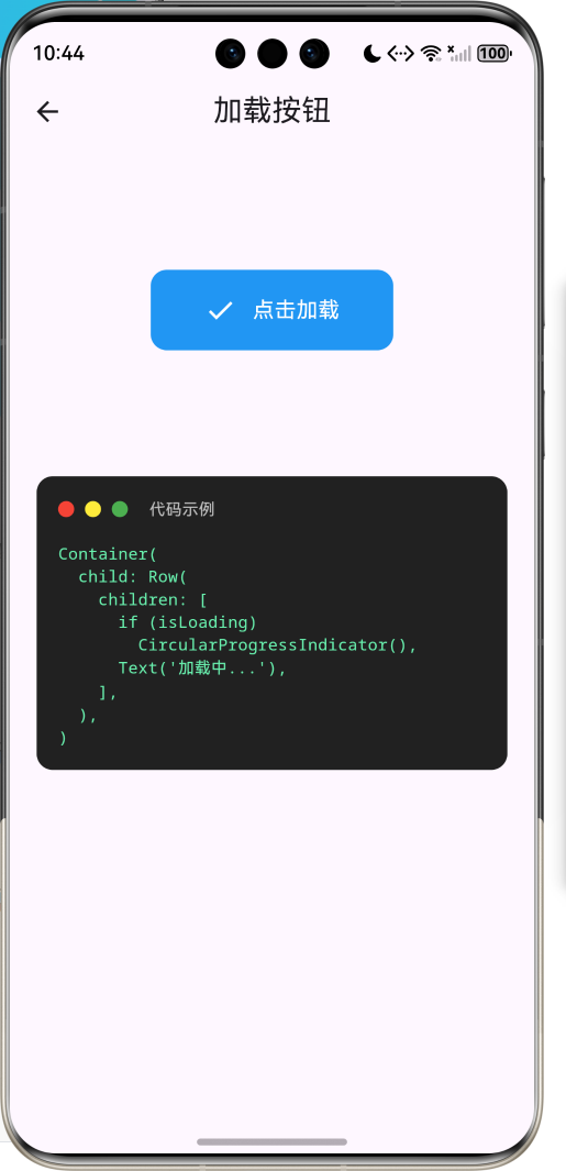 | 按钮详情 | 样式预览与代码示例 | 动画控制器 + 代码高亮 |