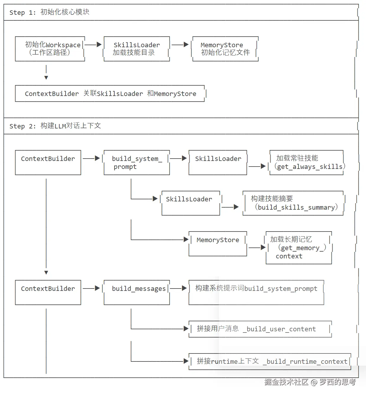 ContextBuilder 类是 Nanobot Agent 的「上下文大脑」,将分散的身份、记忆、技能、运行时信息整合为 LLM 可识别的标准化对话上下文;其核心价值为:屏蔽了上下文构建的复杂性,为 Agent 提供「开箱即用」的完整对话上下文,是连接 Agent 各模块与 LLM 的核心枢纽。
