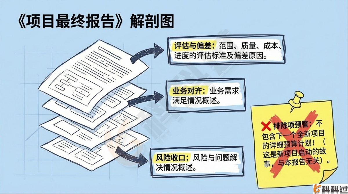 详细解析 :项目最终报告包含项目或阶段的概述、范围目标/质量目标/成本目标/进度计划目标及其完成与偏差情况、如何满足业务需求的概述、项目中发生的风险或问题及解决情况概述等。下一个全新项目的预算不属于本项目最终报告的内容。