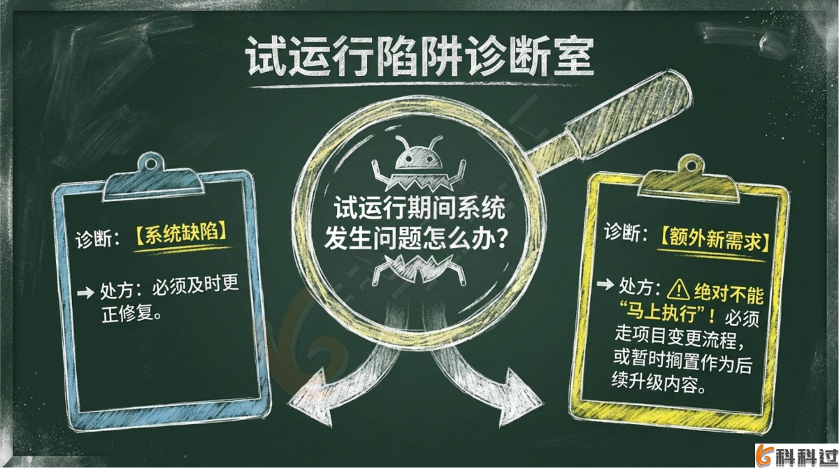 试运行期间问题处理:系统缺陷→及时更正;新需求→变更流程或搁置升级