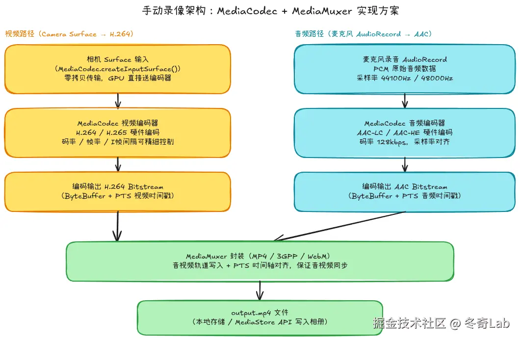 本文系统梳理Camera2录像的两条实现路径:MediaRecorder高层封装 (快速上手)和MediaCodec+MediaMuxer手动控制(灵活精细),帮你把每个坑都提前踩掉。