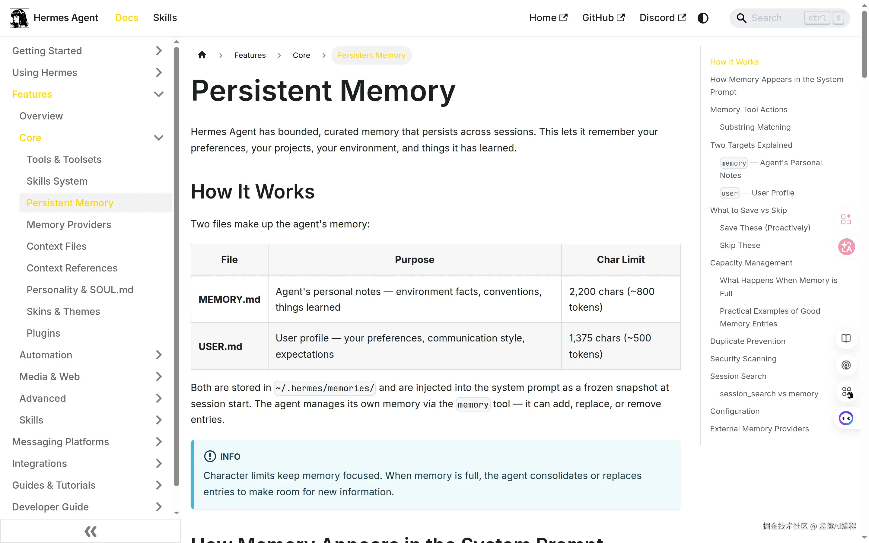 MEMORY.md(agent 自己的笔记)→ 上限 2200 字符USER.md(用户画像)→ 上限 1375 字符