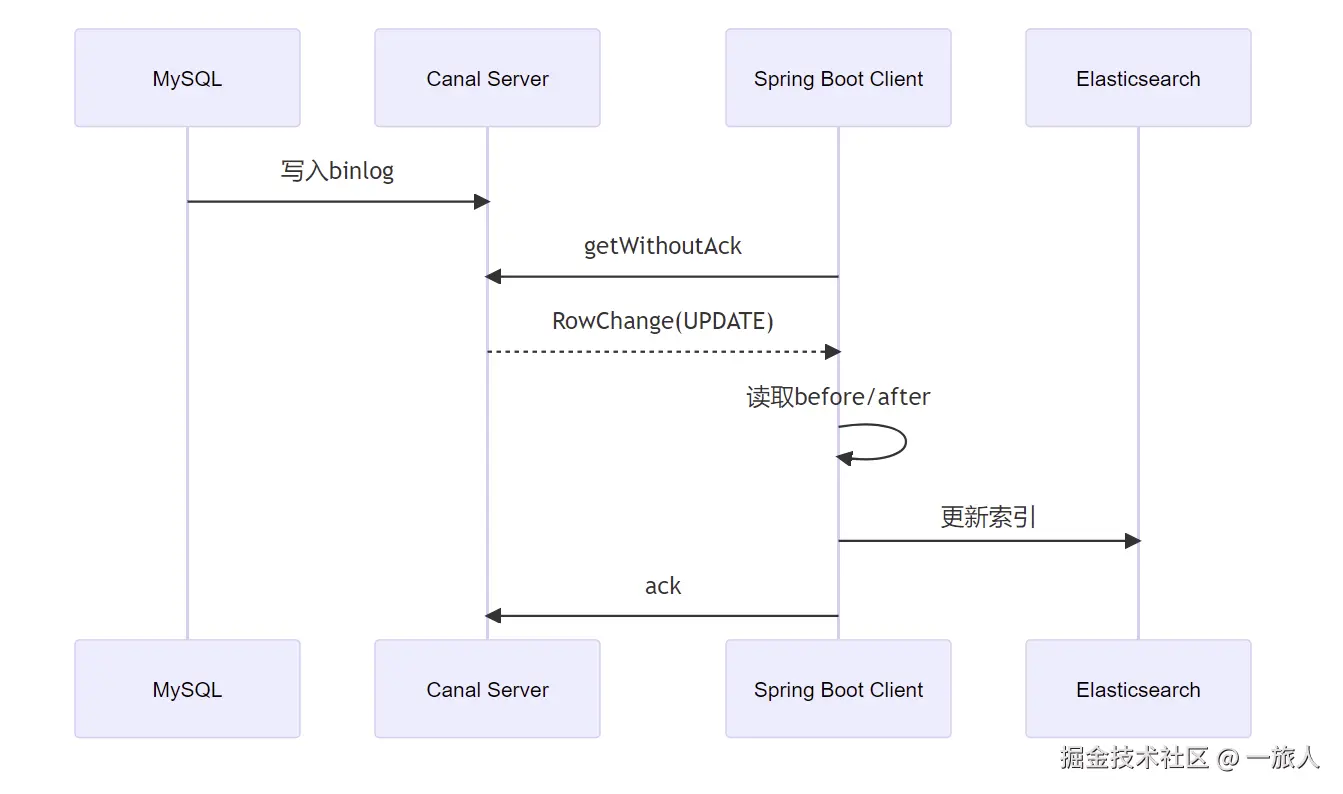 业务写MySQL → MySQL记录binlog → Canal解析 → 业务消费 → ES/Redis更新