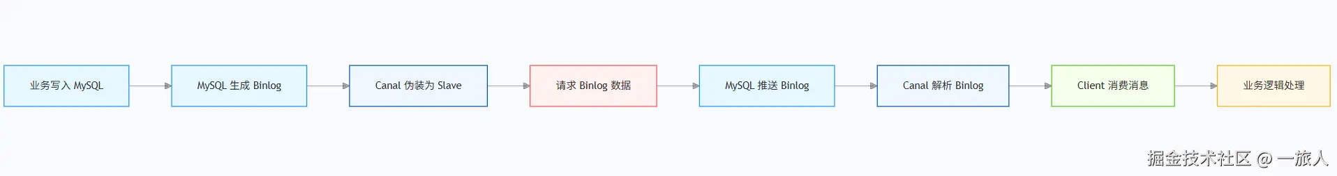INSERT / UPDATE / DELETE时,MySQL 会把这些变化写到 binlog 中。 - Canal 伪装成 MySQL slave: Canal 会模拟从库,与 MySQL 建立复制连接。
