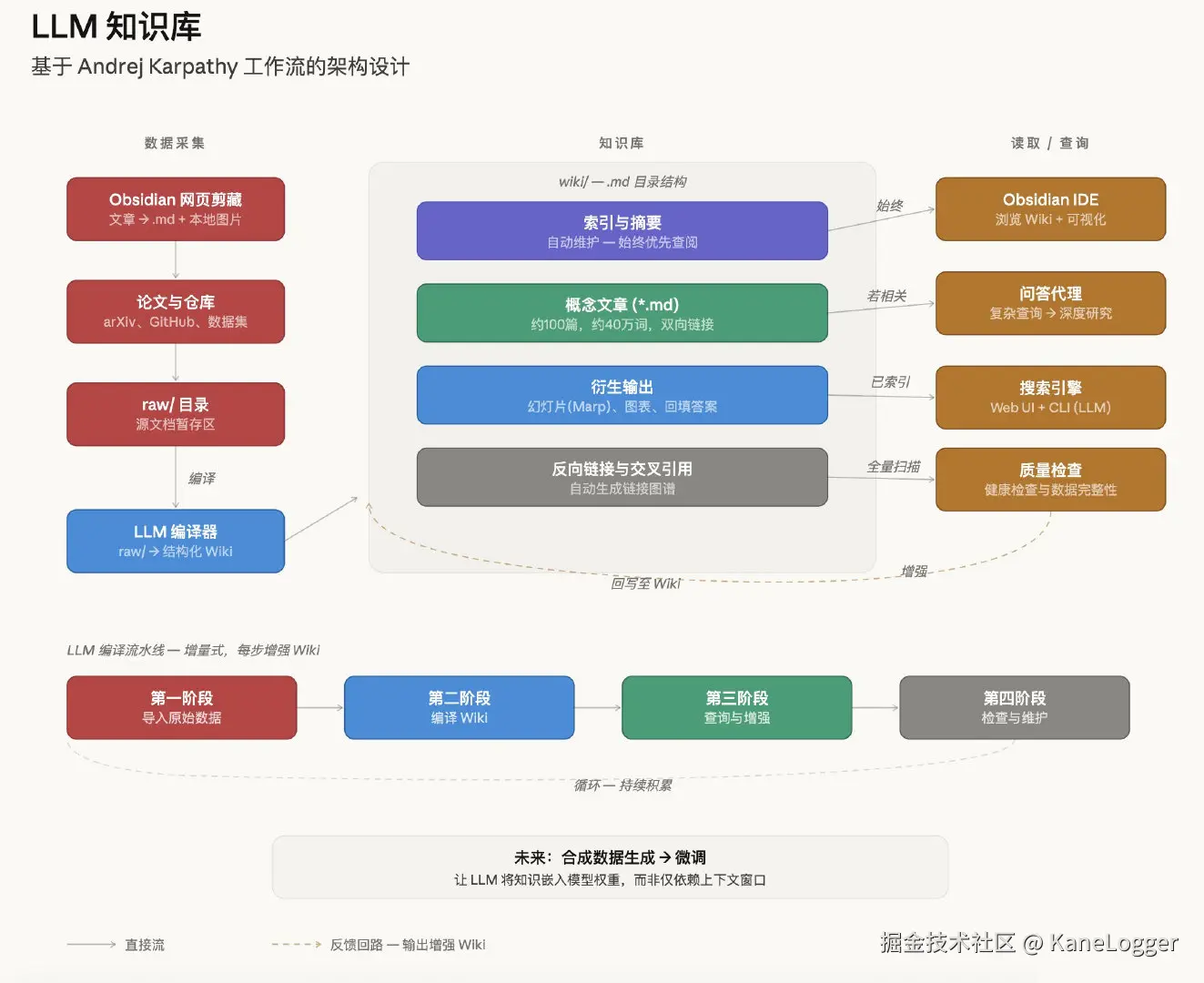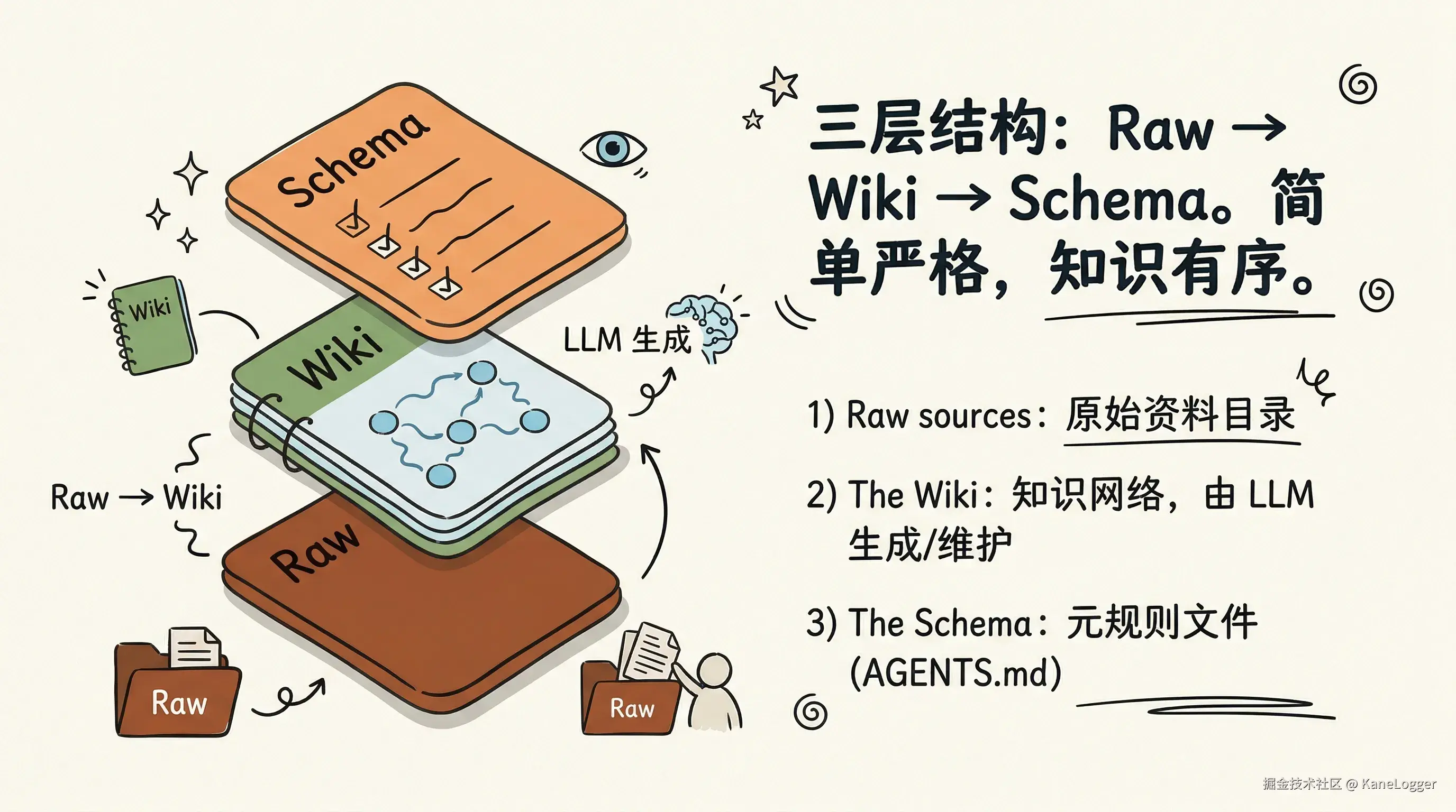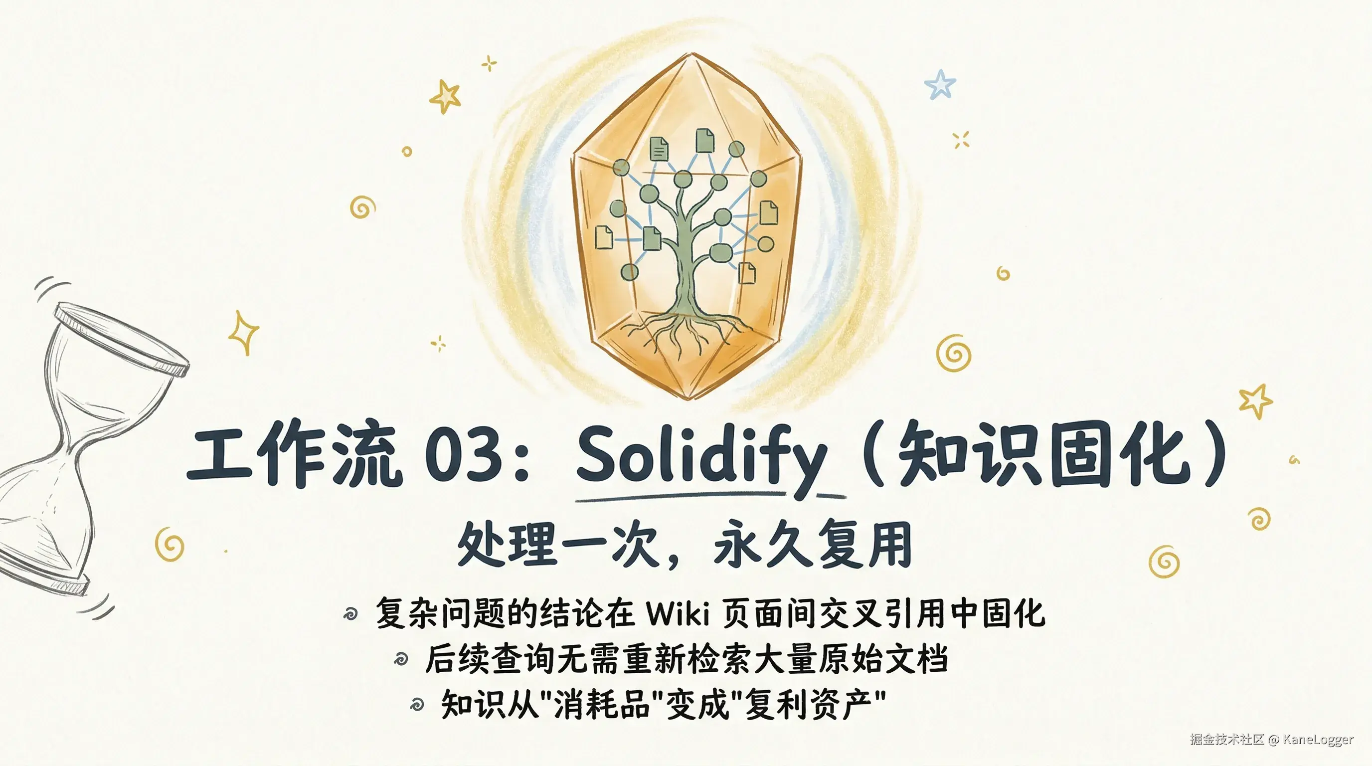 - 知识固化(Solidify):知识被深度处理一次后,复杂问题的相关结论便在维基页面间的交叉引用中固化,后续查询无需重新检索大量原始文档。