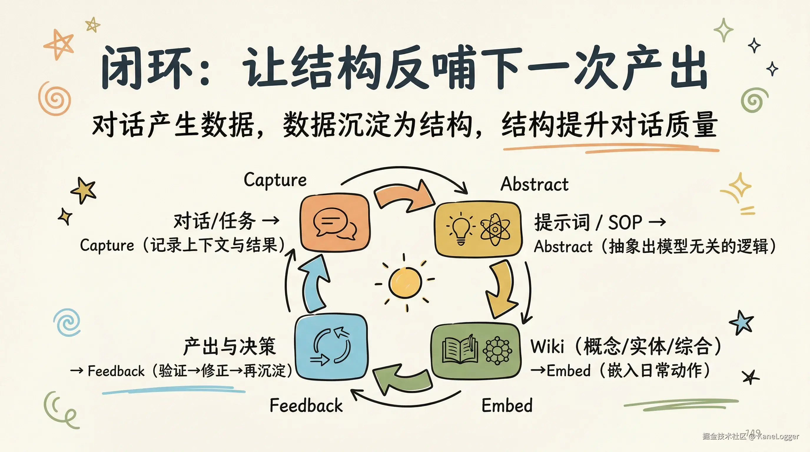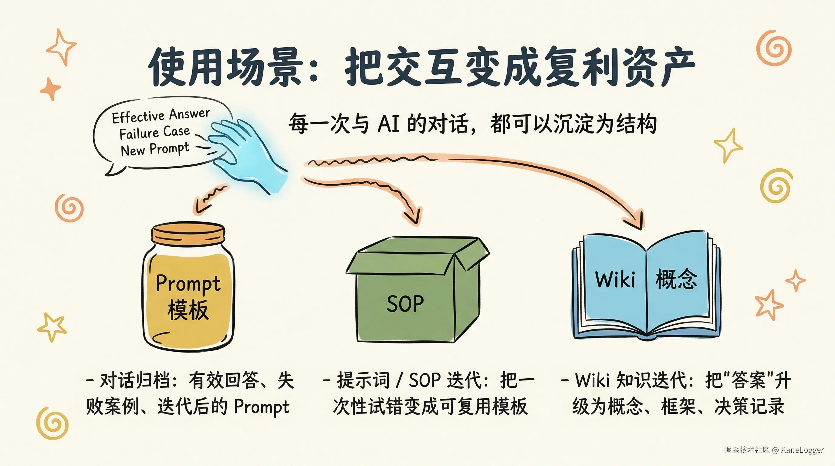 - Wiki 知识 → 迭代:把"答案"升级为"概念/框架/决策记录",形成跨主题复用