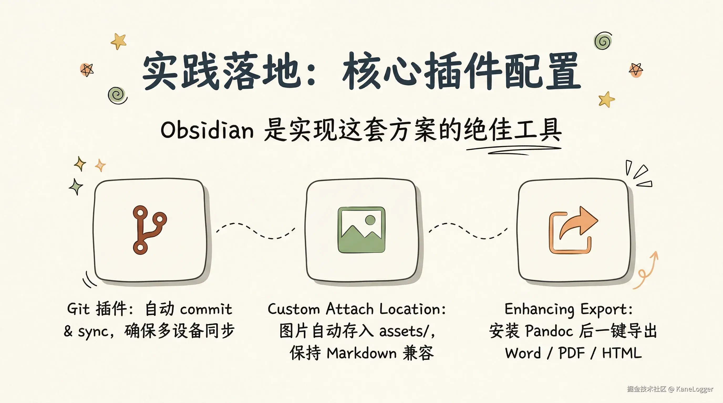 | Git | 自动化版本管理,实现与 GitHub 的无缝同步 | • Auto commit-and-sync interval: 1 分钟 • Auto commit-and-sync after stopping file edits: 开启 • Pull on start: 开启 |