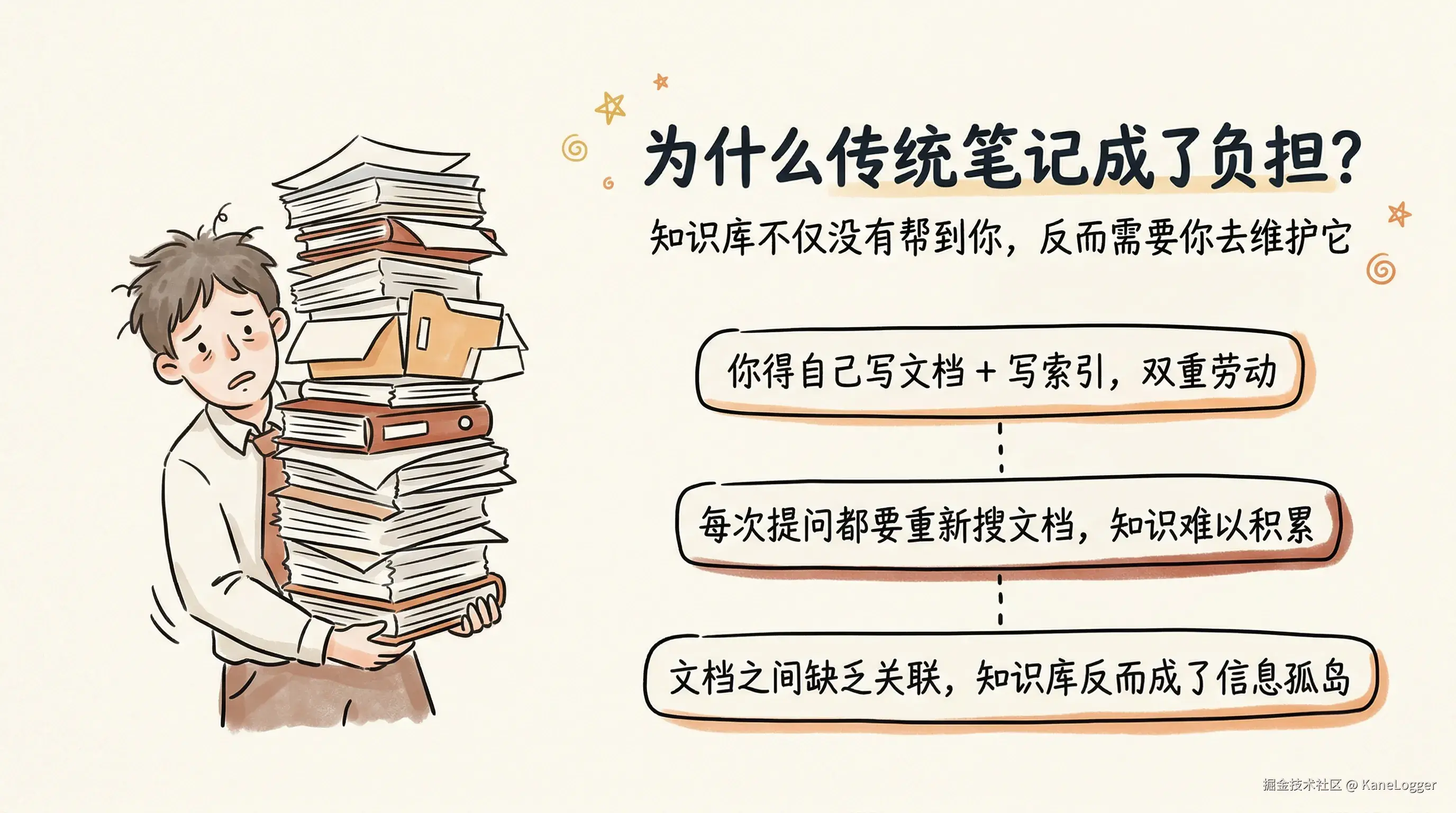 以前维护知识库成本太高:一个人除了写文档,还得写索引;每次提问都得重新搜文档,知识难以积累,知识库反而成了负担。