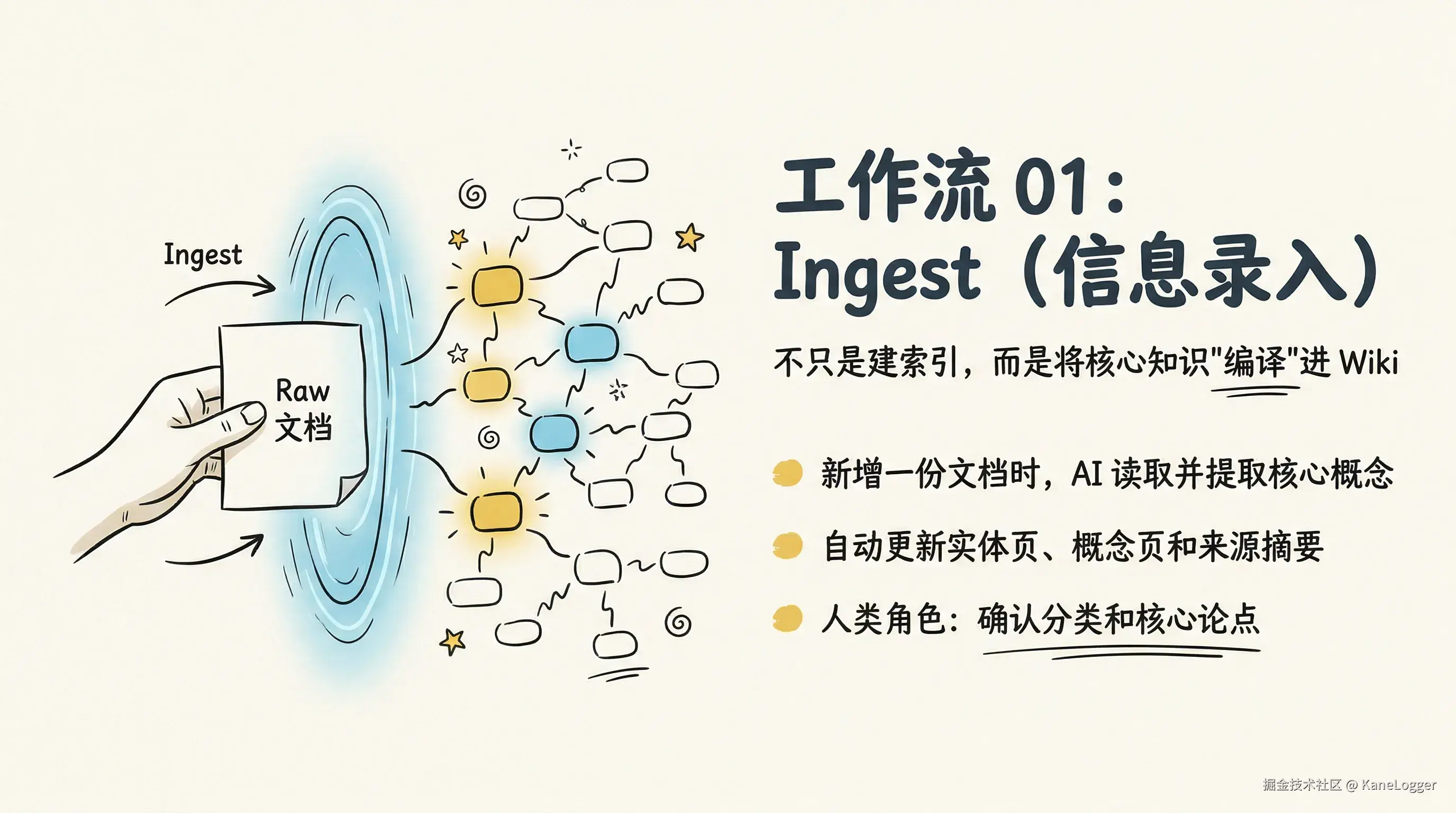 - 信息录入(Ingest):新增一份文档时,LLM 不仅仅是建立索引,而是将其核心知识"编译"进现有的 Wiki 结构中。