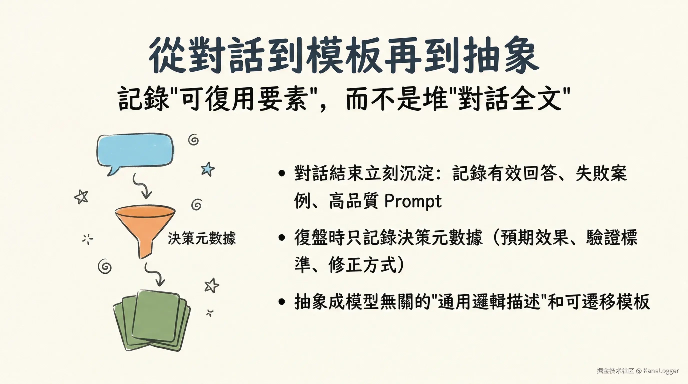 /achieve。 - 复盘时只记录"可复用要素"(决策元数据),而不是堆"对话全文":