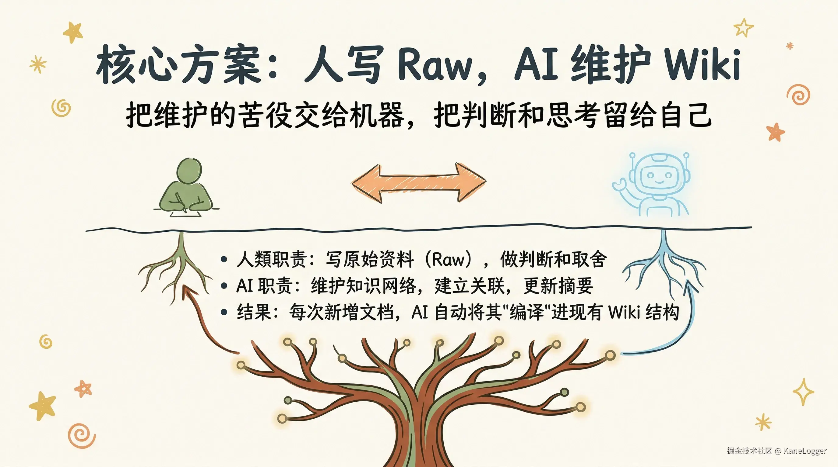 - 机器的职责:承担所有维护苦役。LLM 负责梳理逻辑、维护交叉链接、更新摘要、检查全库一致性------机器做整理。