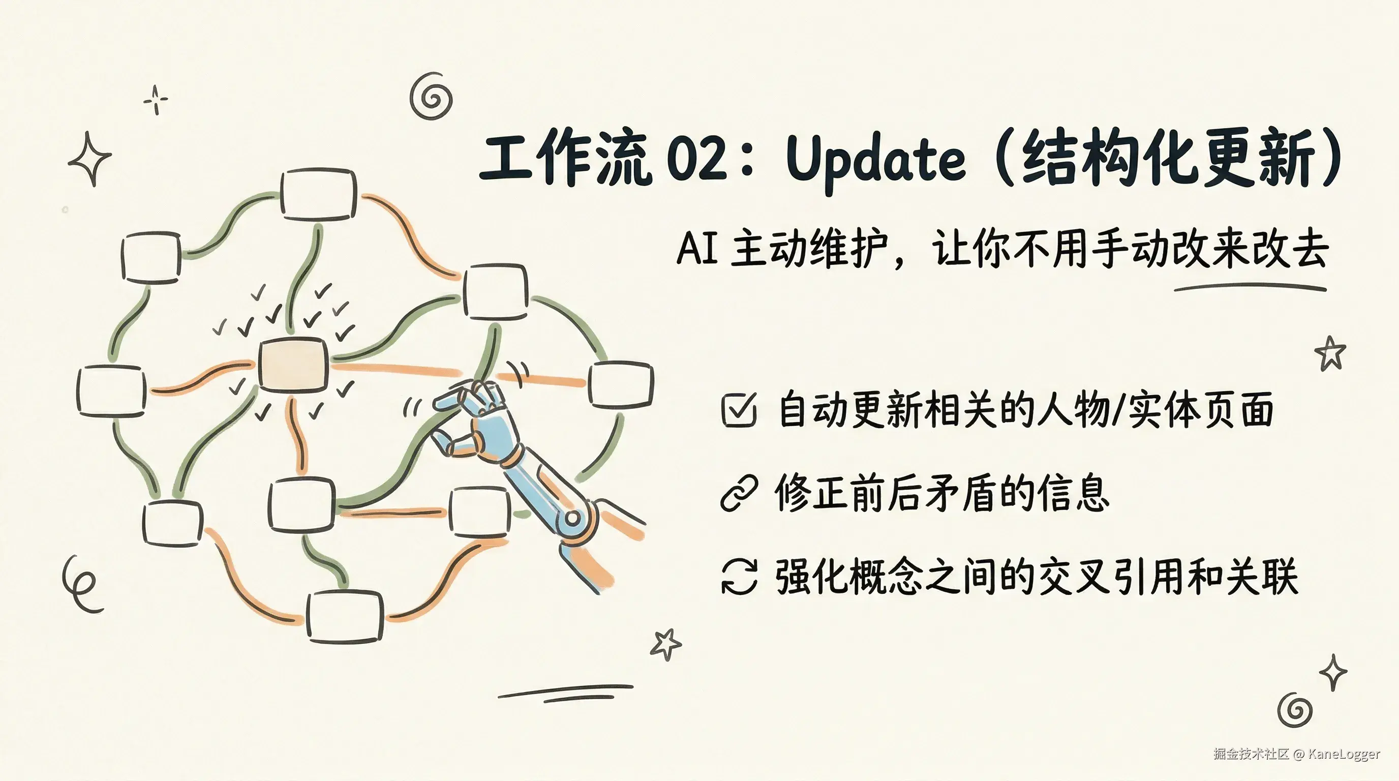 - 结构化更新(Update):自动更新相关的人物页面、修正前后矛盾的信息、强化概念之间的关联。