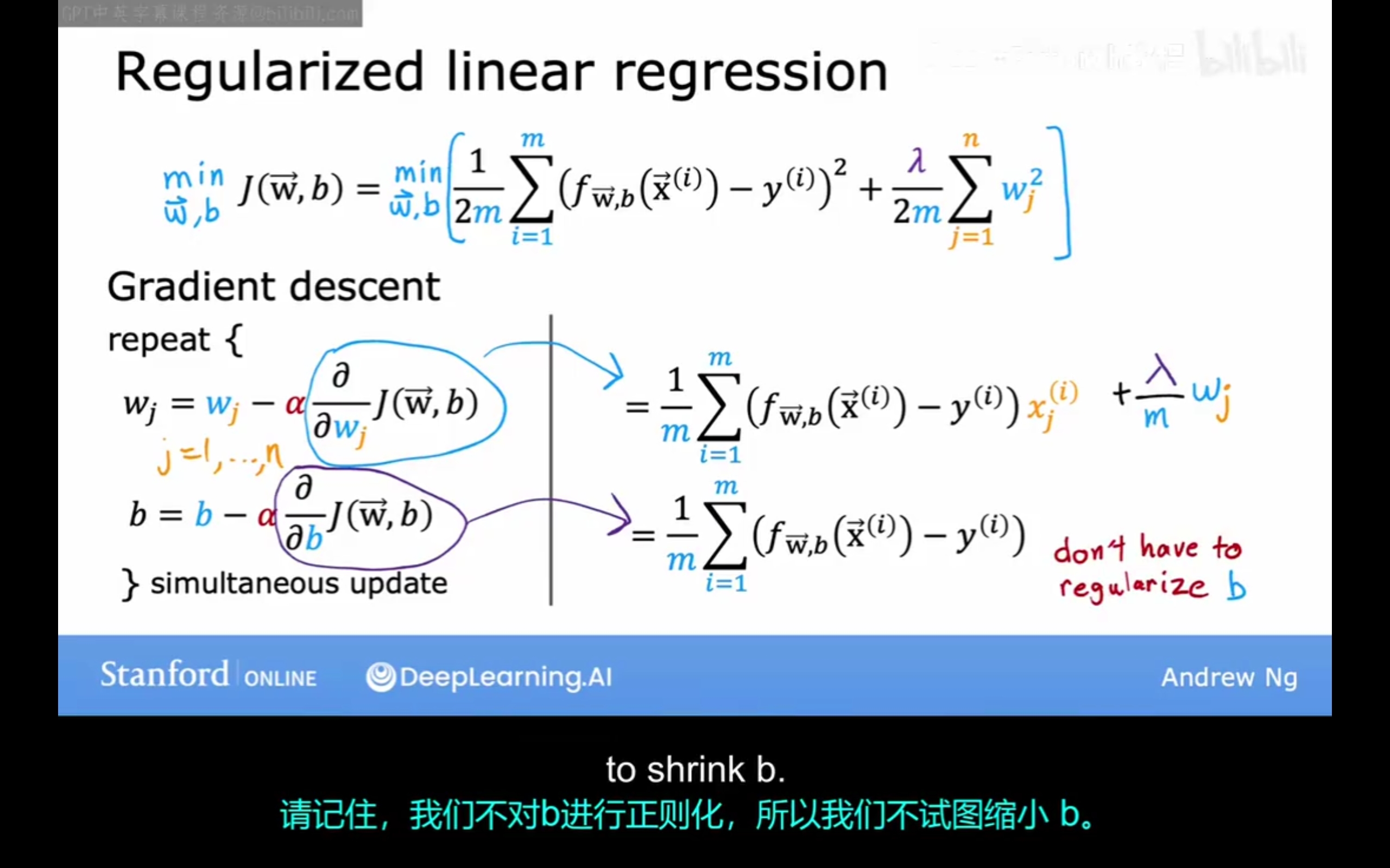 将参数设置为0等同于消除一个特征。是一种更温和的减少某些特征影响的方法。正则化鼓励学习算法缩小参数的值,而不一定要求参数精确的设置为0。保留所有特征,但防止特征产生过大影响。通常只减少wj参数的大小,是否也正则化参数b并没有太大区别。