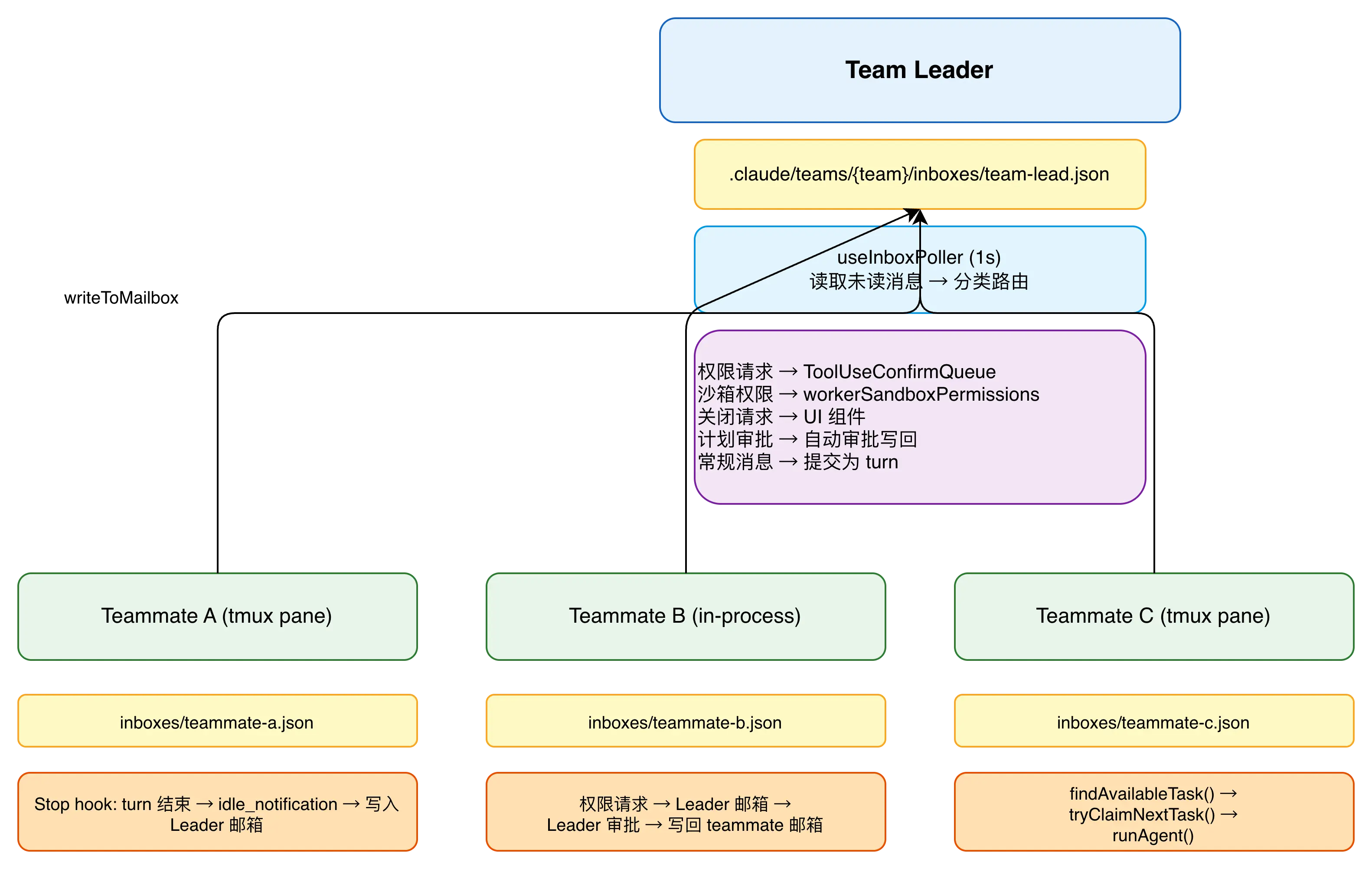 团队模式下,队友(Teammate)可能运行在不同进程(tmux pane / iTerm2 pane),通过文件邮箱系统通信:写入 .claude/teams/{team}/inboxes/{agent}.json,Leader 每 1 秒轮询一次。