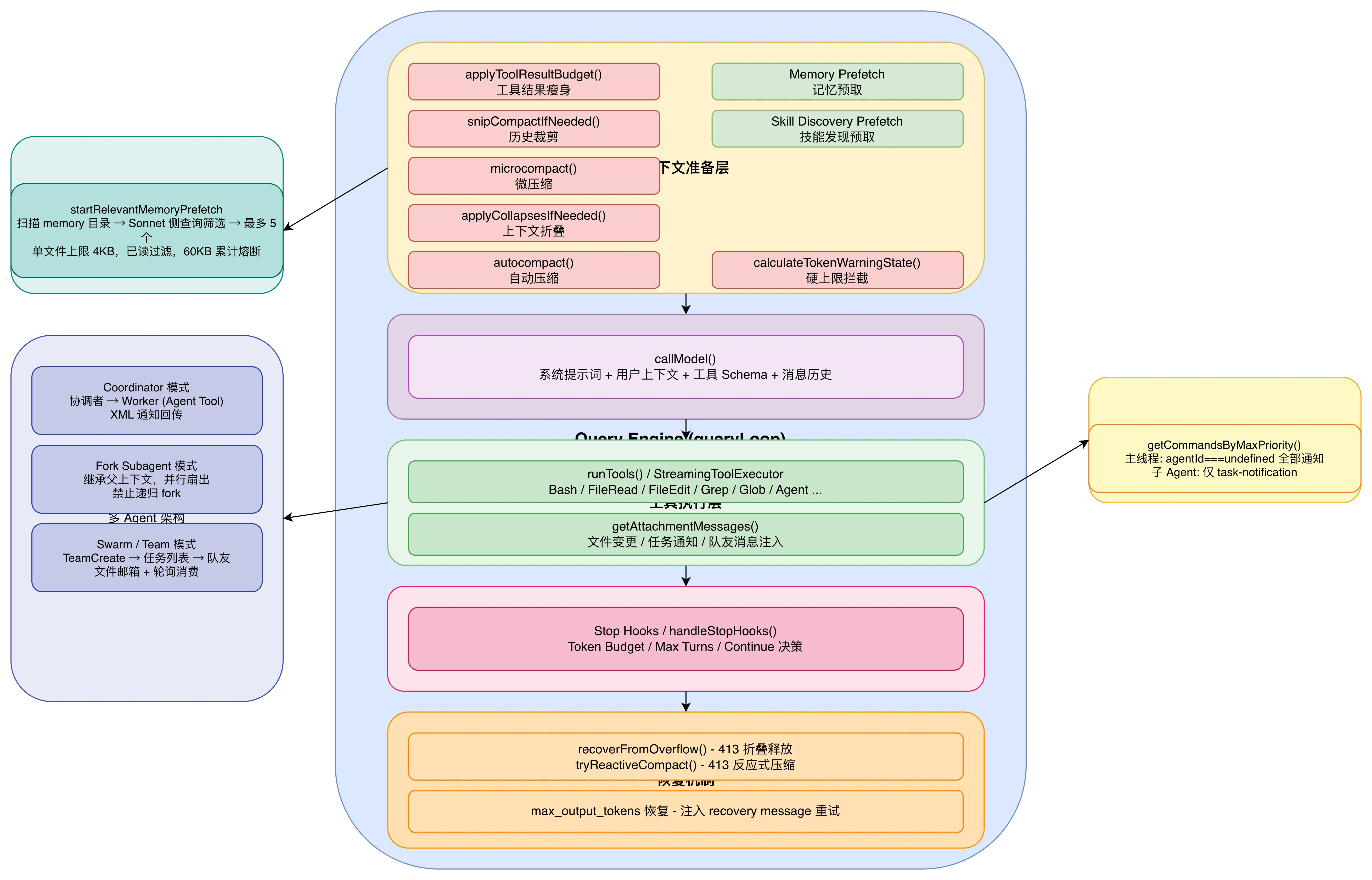 Claude Code 的 queryLoop() 从零手写了整个 Agent 循环。query.ts 里 1700 多行代码完整实现了:上下文准备管线(6 层压缩)、模型调用、工具执行、附件注入、停止决策、错误恢复。没有任何外部 Agent 框架参与。