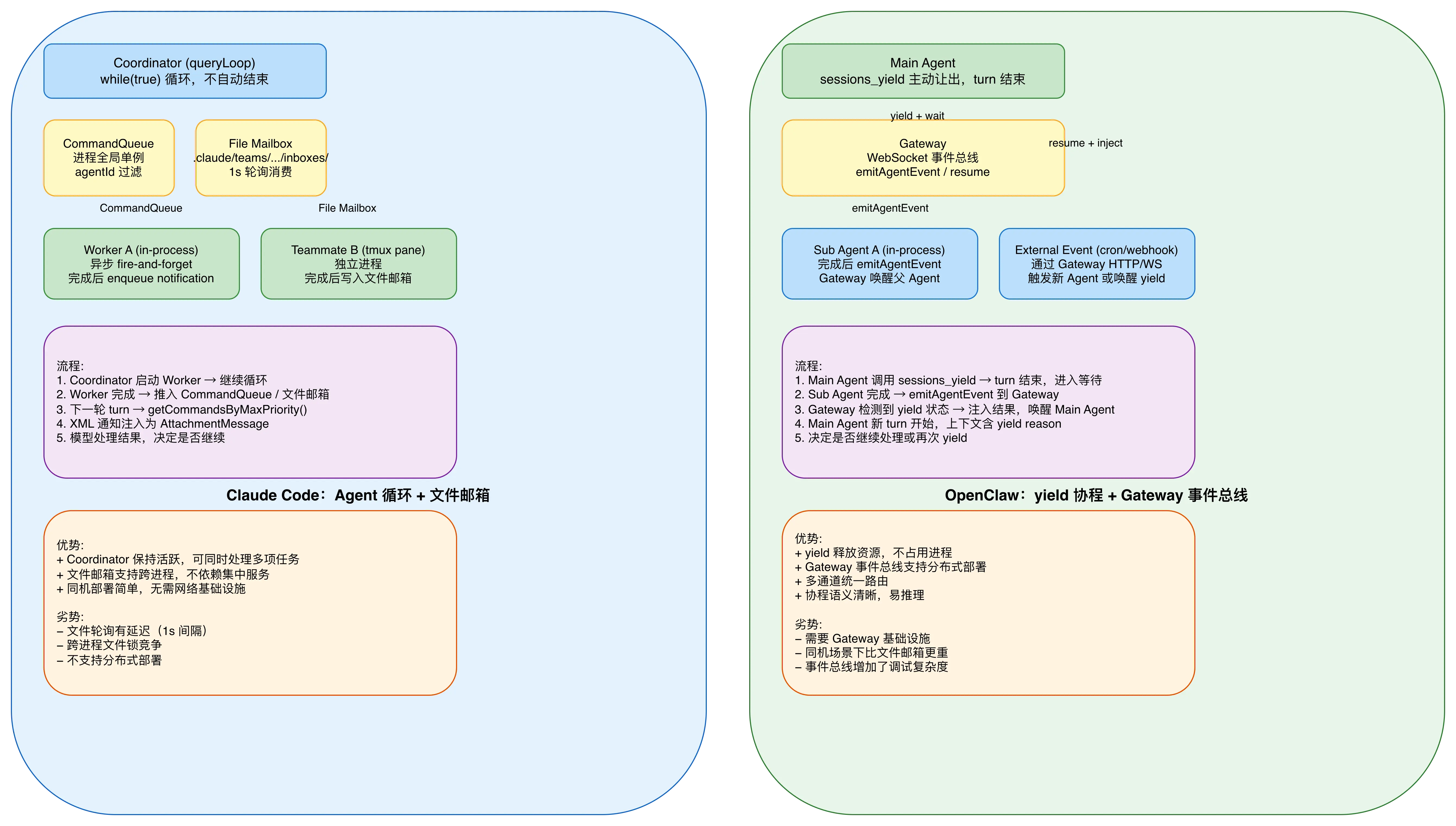 两者在异步 Agent 的核心思想上是一致的:父 Agent 启动子 Agent 后不阻塞等待,子 Agent 完成后通过某种通知机制把结果送回。这都体现了"非阻塞优先"的设计理念。两者的 CommandQueue 和 Gateway 事件总线在功能上是等价的------都是解耦生产者和消费者的消息通道。