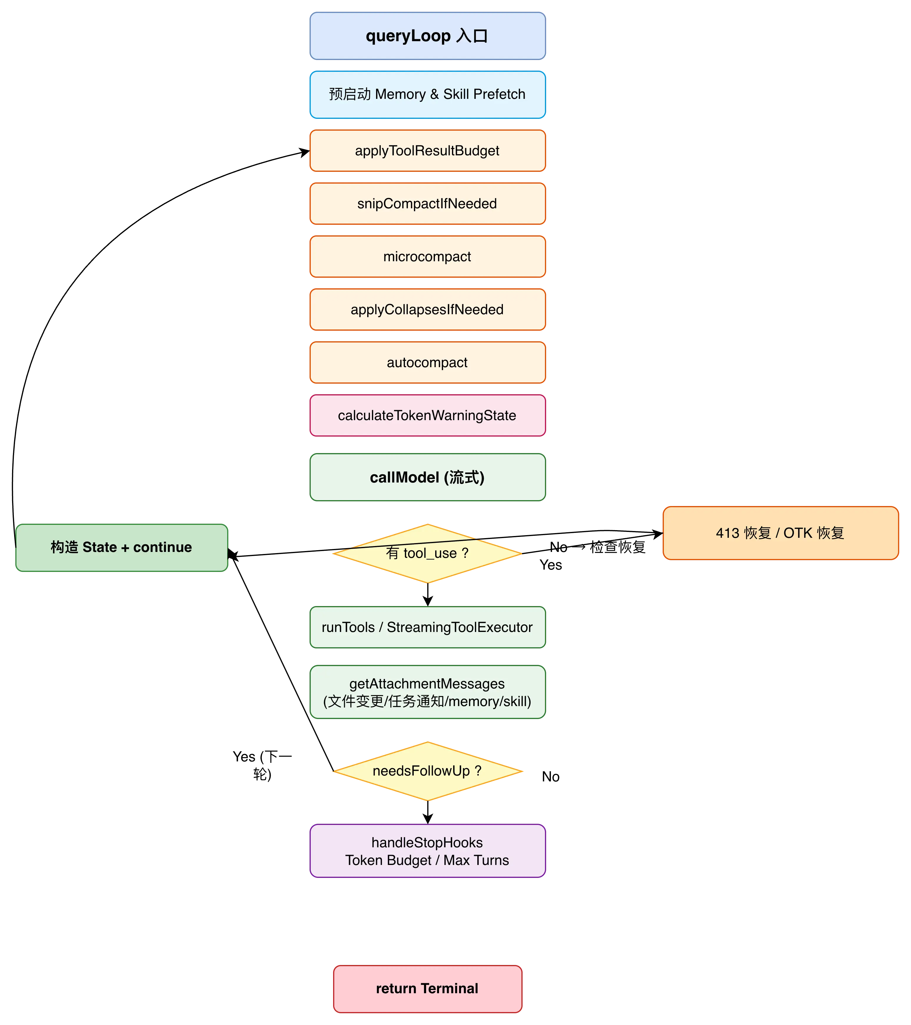 这种设计的优势在于:continue 站点只需要构造一个新的 State 对象然后赋值 + continue,不需要分别更新 9 个变量。同时 transition 字段记录了上一次循环继续的原因,让后续迭代能够基于前一次决策做判断(比如判断上一次是否已经做过 collapse_drain_retry,避免重复操作)。