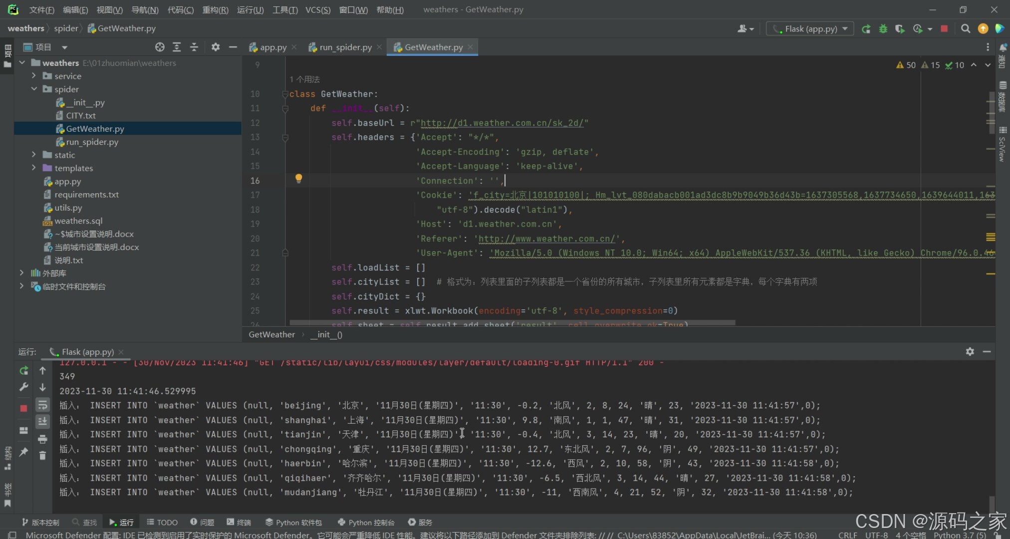 该页面是全国气象数据爬取分析平台的代码开发界面,展示Python气象数据采集相关代码,实现从指定接口获取天气数据、处理请求头与城市配置,控制台实时输出数据插入数据库的SQL语句,完成气象数据的自动化采集与入库。